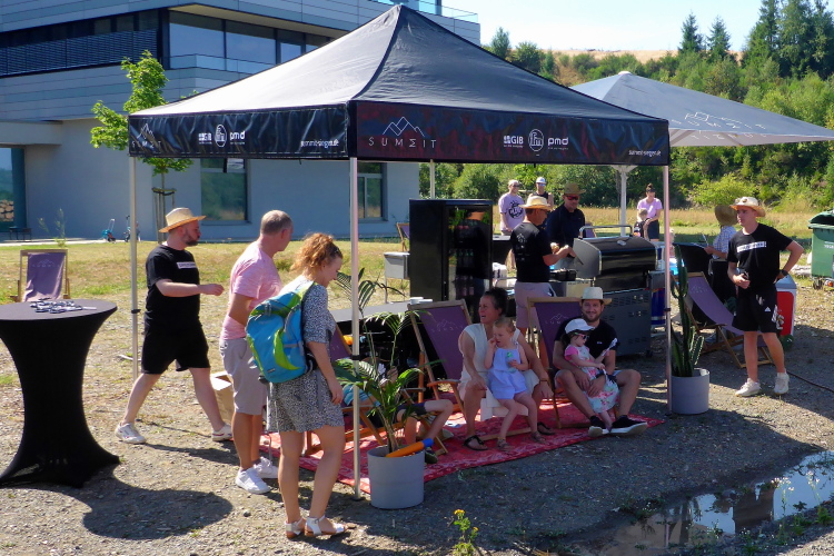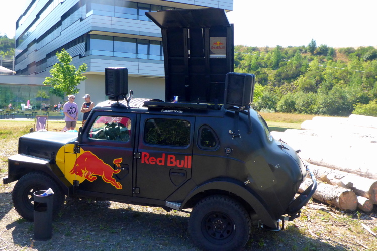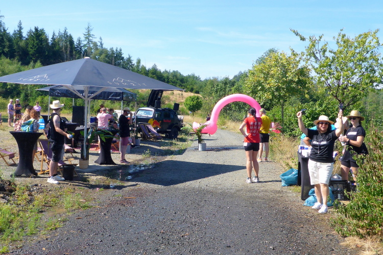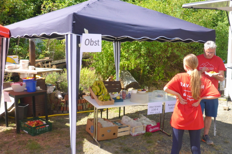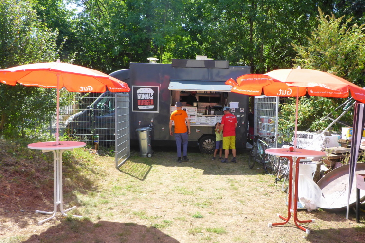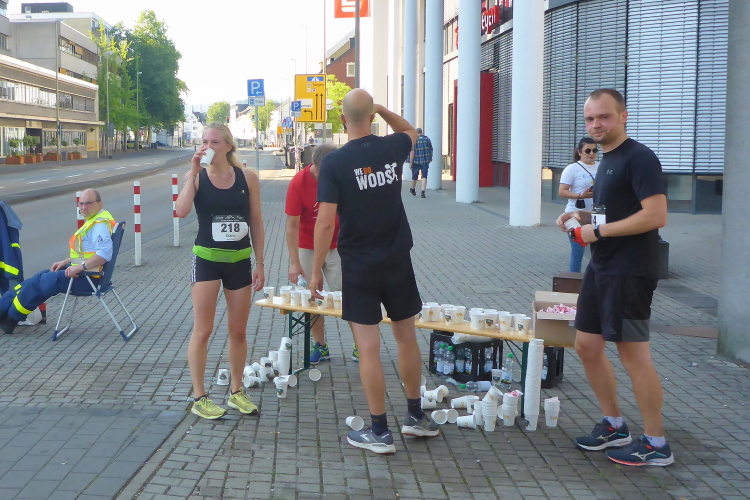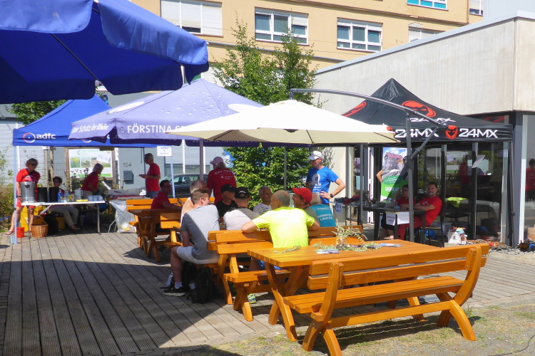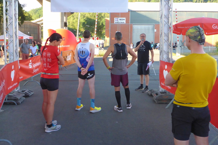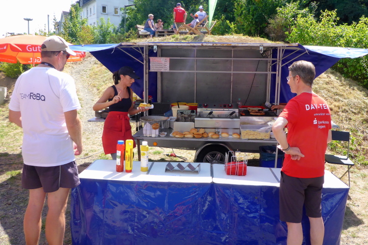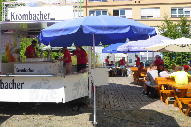 Wir werden mit einer hübschen Holzmedaille geehrt und finden uns im Versorgungsbereich wieder. Obst und Riegel, Wasser und was Kühles aus dem Hause Krombacher dienen zur Erstversorgung. Im weiteren Verlauf ist ein umfangreicher Cateringbereich aufgebaut: Burger-Truck, Grill, Bier-Rondell, Kaffee, Kuchen und ein Obstverkauf vom DAV. Man weiß gar nicht, wo man anfangen soll! Im Starterbag sind noch Wertbons enthalten, die man hier direkt einlösen kann. Eine Bratwurst im Brötchen mit einem kühlen Radler, ein schattiger Platz auf reichlich vorhandenen Sitzgelegenheiten unter Zelten und die Regeneration beginnt. Um uns herum werden gerade noch Siegerehrungen vorgenommen und ich halte schnell die Kamera mit rein. Für die offizielle Einlaufzeit bekommt jeder eine Zeitgutschrift von 5:30 Minuten, um die Wartezeiten an den Ampeln auszugleichen.