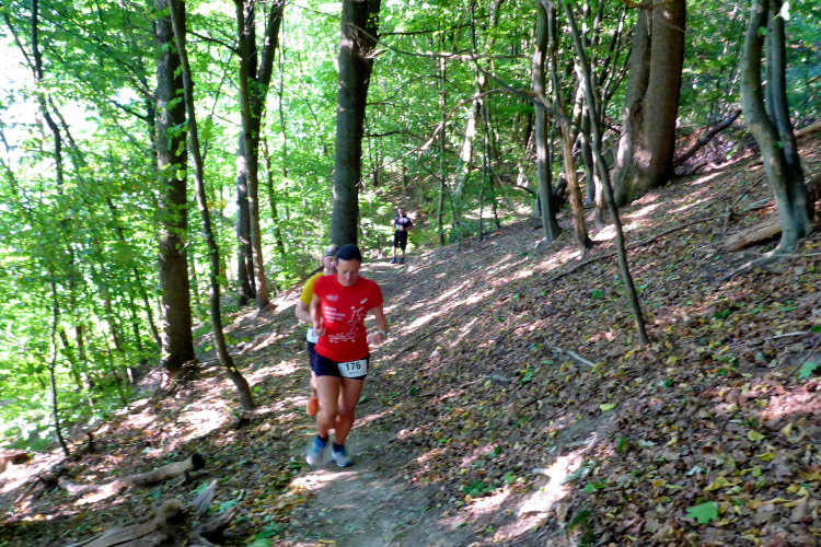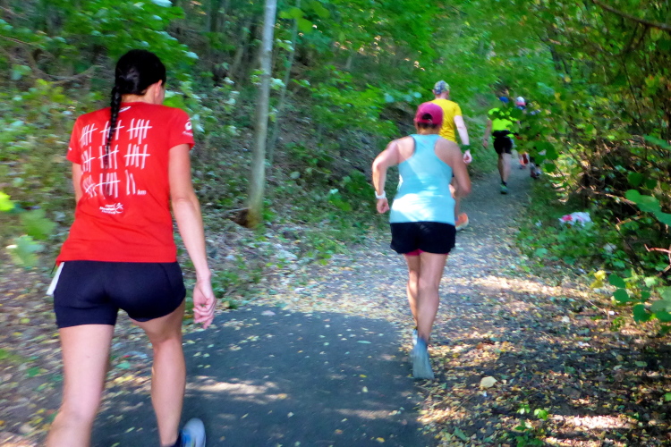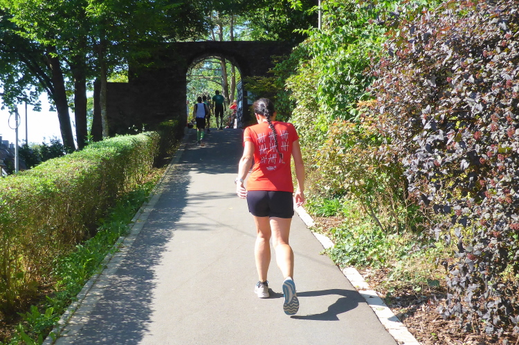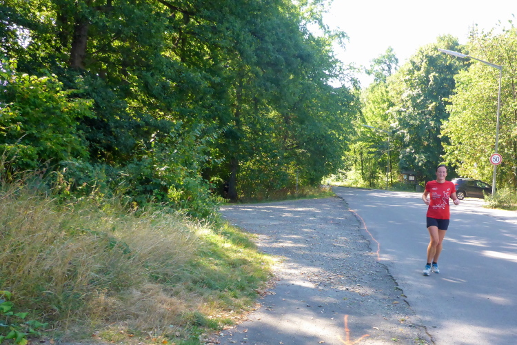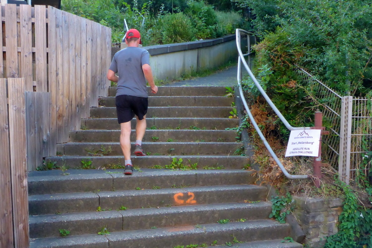 Direkt auf der anderen Seite beginnt Kapitel 2, der Wellersberg. Die erste Treppe liegt vor uns und zeigt auf, dass auch nach gerade mal 5 km die Beine beim Emporsteigen weich werden können. Der erste respektvolle Gedanke an noch fehlende 600 Höhenmeter drängt sich auf, kann sich aber nicht lange halten. Ein relativ langer gerader Abschnitt vorbei am historischen- und dann am Hermelsbacher Friedhof lässt sich locker traben und die Treppen schnell vergessen. Dann beginnt die zweite Phase des Anstiegs zur längst stillgelegten Panzerstraße der belgischen Garnison. Wir rollen ins nächste Tal und erreichen bei der Glück-Auf-Kampfbahn den Stadtteil Weidenau. Hier startet auf dem Bismarckplatz jedes Jahr der beliebte und immer ausgebuchte Firmenlauf mit tausenden Läufern. Beim Hauptsponsor Sparkasse gibt es bei km 8,5 die erste Verpflegung direkt an einer Ampel gelegen, welche für eine kleine Pause sorgt.