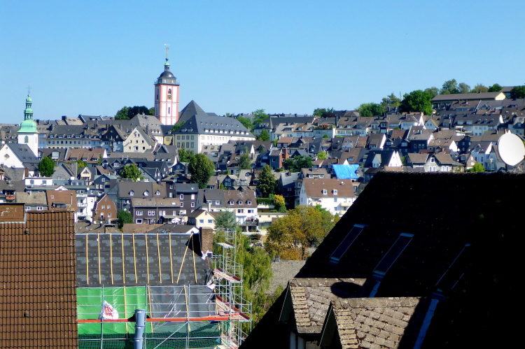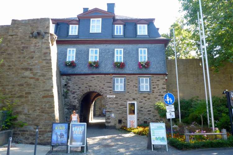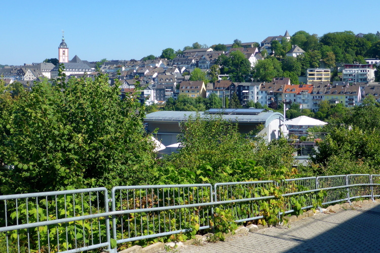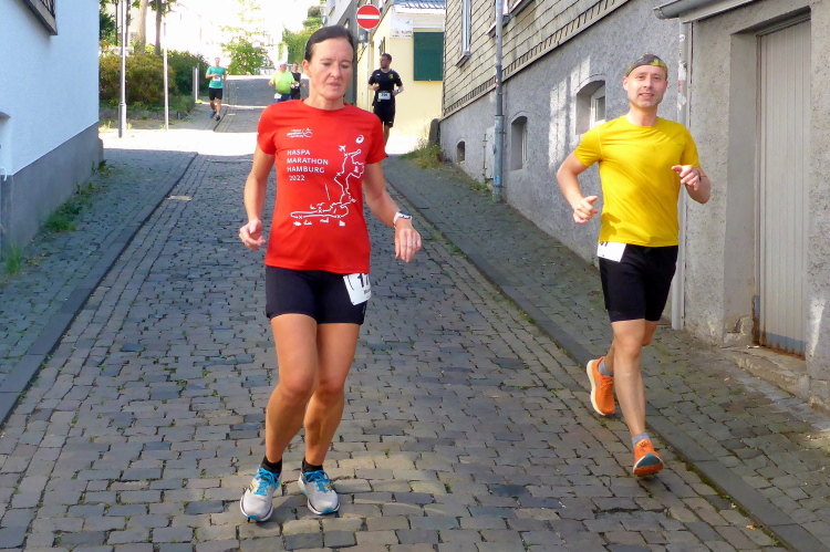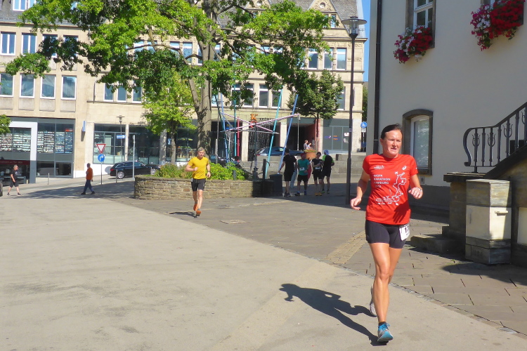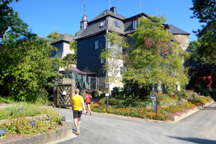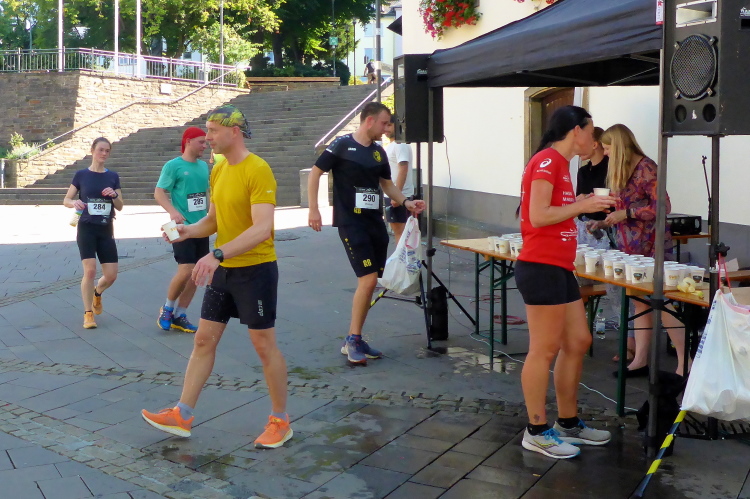 Angekommen im Tal der Weiss, ein Nebenfluss der Sieg, eröffnen wir das 5. Kapitel. Nicht ganz so hoch, aber ähnlich steil geht es auf den Siegberg. Wir quälen uns empor, als uns ein pfiffiger Streckenposten vom THW zuruft, dass wir uns Zeit lassen können, denn die vor uns liegende Ampel würde erst in 2 Minuten wieder grün. Also durchatmen! Wir laufen in den Schlosspark und durch das obere Schloss auf 307 m Höhe. Von hier geht es vorbei an der Nikolaikirche, die mit dem goldenen Krönchen, zum Hot Spot und VP 4. Direkt daneben steht ein Brunnen, zum zweiten Mal für heute verweile ich und kühle mich ab. Durch die Oberstadt Gässchen geht es teils über Kopfsteinpflaster hinunter. Für die Altstadtschänke, welche bereits 1646 erstmals erwähnt wurde, bleibt heute keine Zeit.