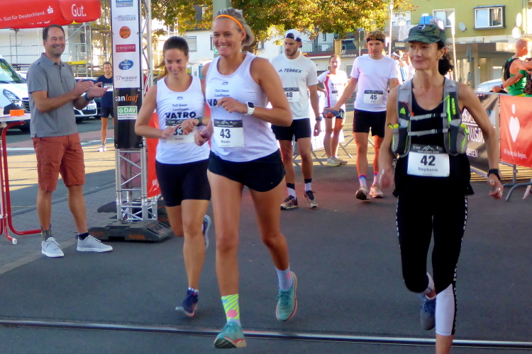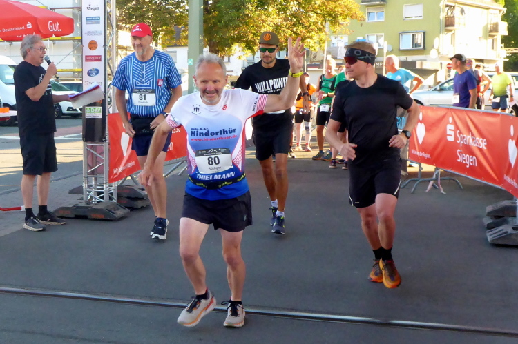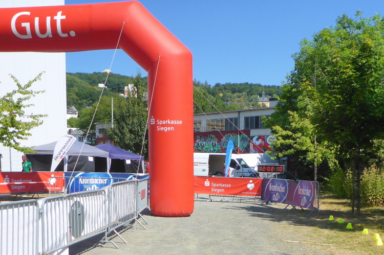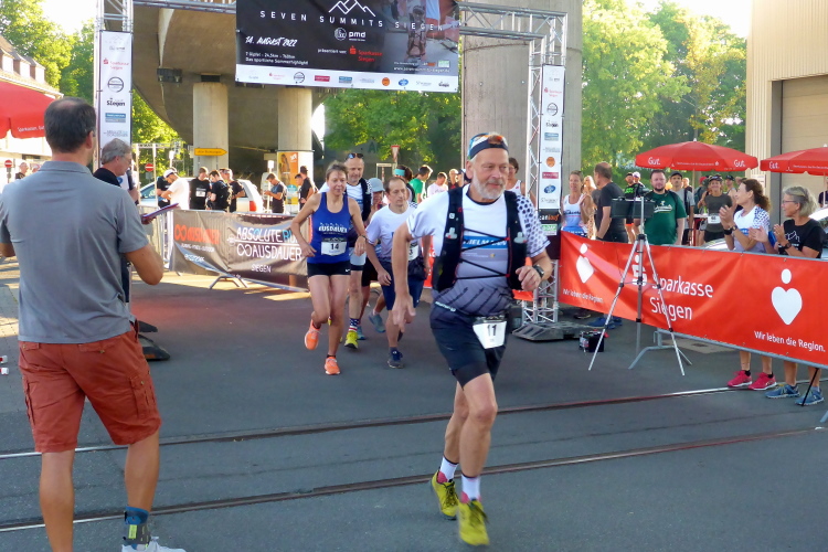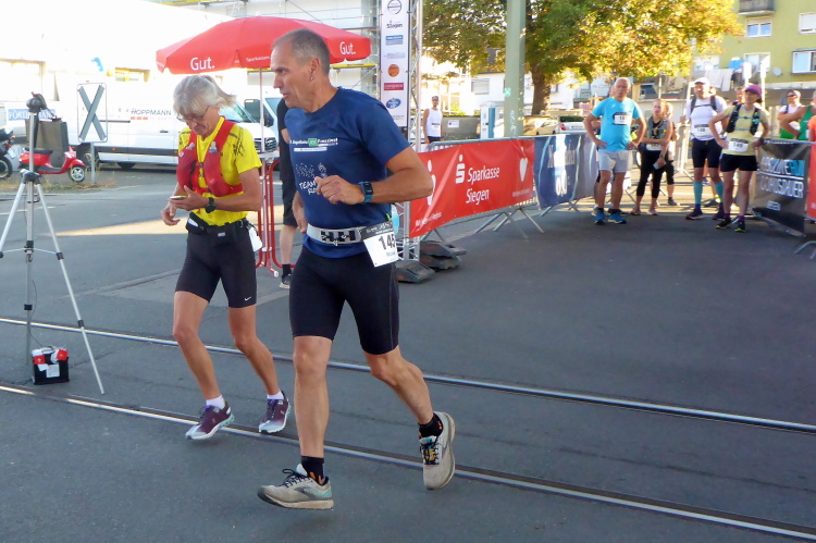 Es geht Richtung Fernsehturm und mit dem letzten und 7. Kapitel unserer Reise dem Rosterberg entgegen. Da wir im Leimbachtal relativ weit oben blieben, ist der Anstieg nicht mehr so wild. Geschätzte 60 Höhenmeter müssen die Beine noch einmal bewältigen, bevor wir am Jung Stilling Krankenhaus vorbei den finalen Gipfel erreichen. Ein entspannter Zuruf vom Streckenposten: „Jetzt nur noch 2 km bergab“ beflügelt und wir drücken nochmal aufs Gas, die Zeit ist erschreckend fortgeschritten. Runter zur Siegerlandhalle, über den Parkplatz, durch eine Unterführung und wir näheren uns Schritt für Schritt dem Ziel. Nach 3:29:24 drücke ich die Uhr auf Stopp, wenn das mal keine Punktlandung ist.