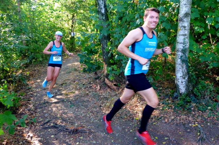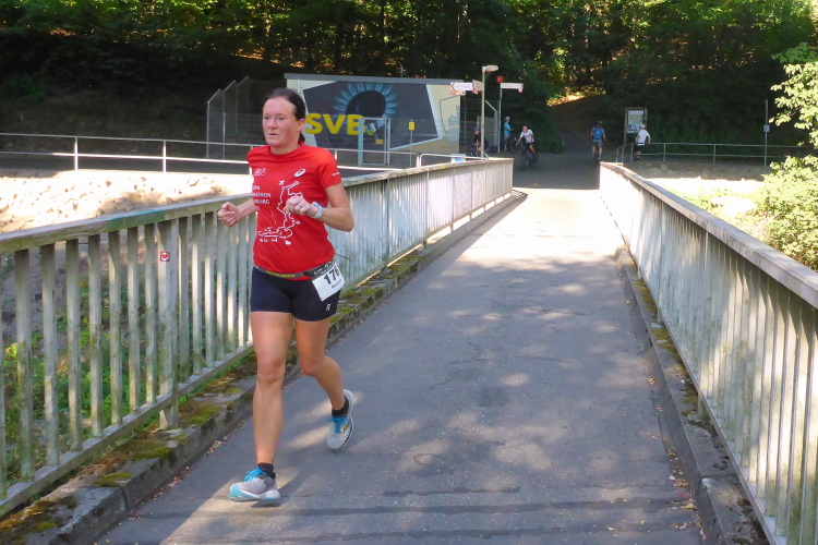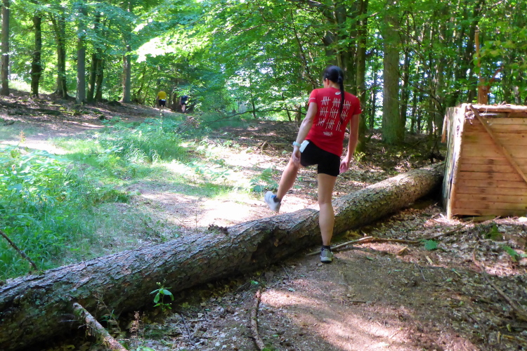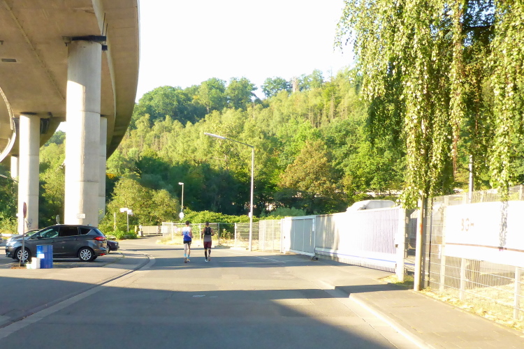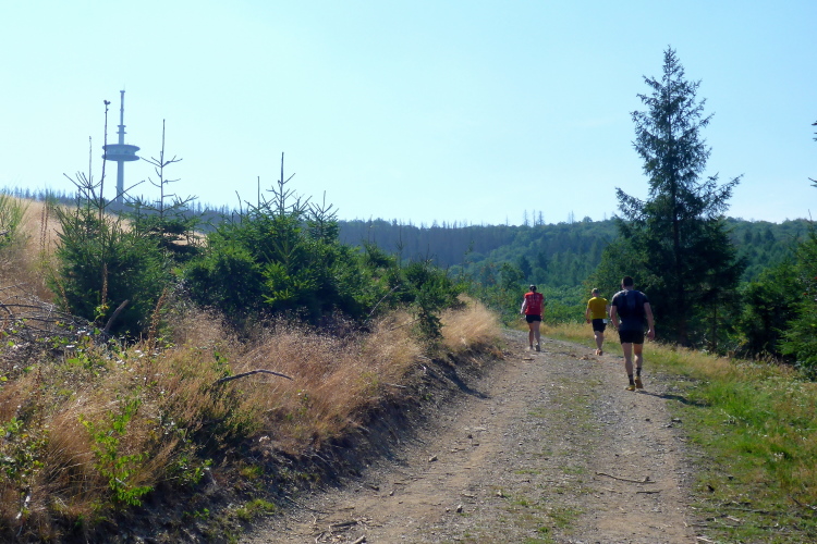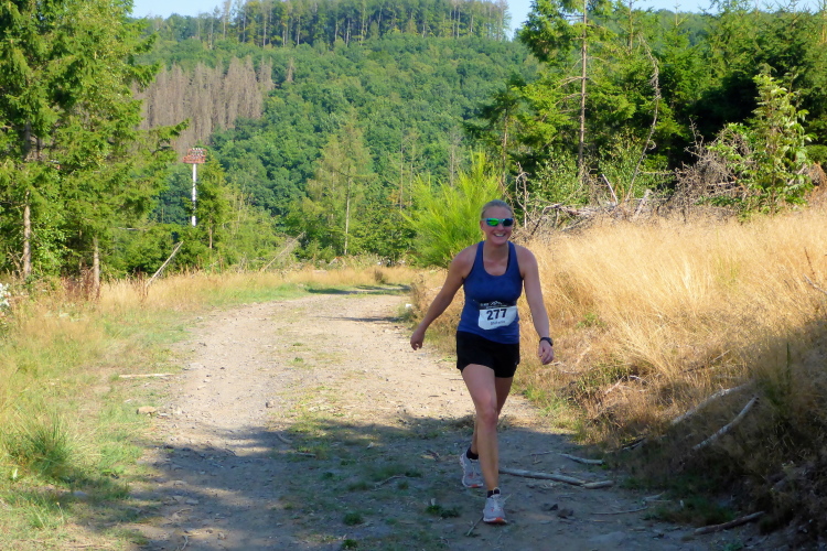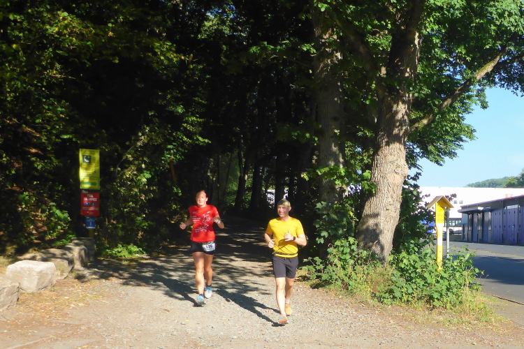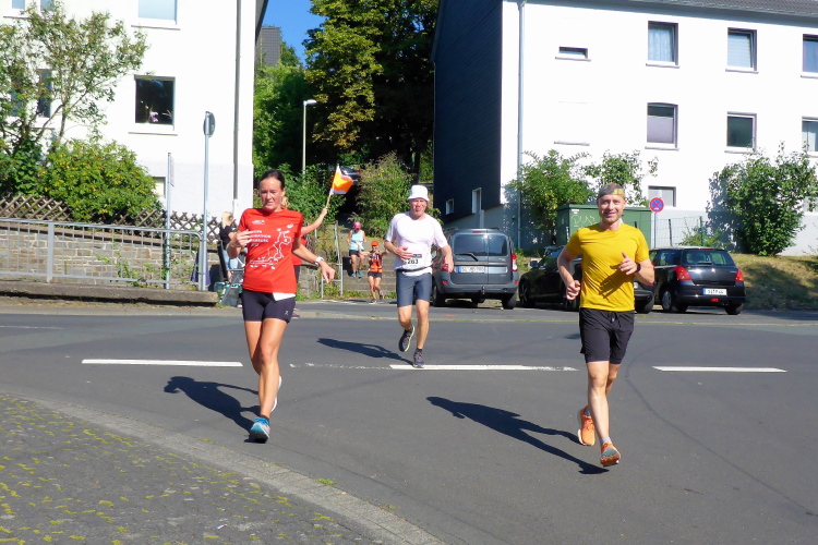 Bevor der erste Kilometer erreicht ist, verlassen wir bereits erstmalig den Teer und laufen über einen Single Trail leicht ansteigend durch die noch angenehm kühlen Wälder. Als wir diese verlassen, beginnt das erste der sieben Kapitel, denn der Fischbacherberg ist als erster Summit zu erklimmen. Auf rund 1 km geht es rund 100 Höhenmeter nach oben, der erste Gipfel ist nach 3 km mit 150 Höhenmetern erklommen. Es geht durch die Wohnblocks auf dem Fischi etwas über Teer. Beim Flowtrail von Mountainbike Siegerland, einer beliebten 4 km langen Downhill Piste, verschwinden auch wir wieder auf angenehmen Waldwegen und Trails. Wir geben die erkämpfte Höhe fast vollständig wieder ab und kommen zum Hauptquartier des THW in der Numbach. Viele der blauen Helfer sind ausgerückt und helfen uns an markanten Punkten auf der Strecke. So auch an der nun folgenden Ampel, als man uns kommen sieht wird schon mal grün angefordert und wir kommen hier fast ohne Wartezeit über die erste Hauptstrasse die es zu queren gilt.
