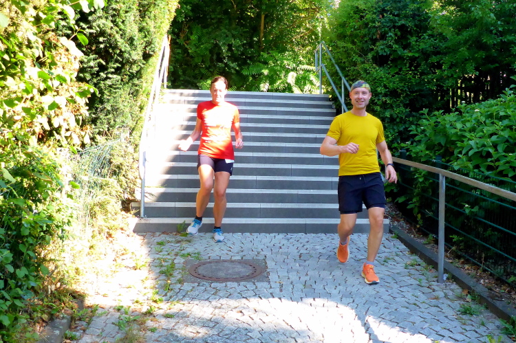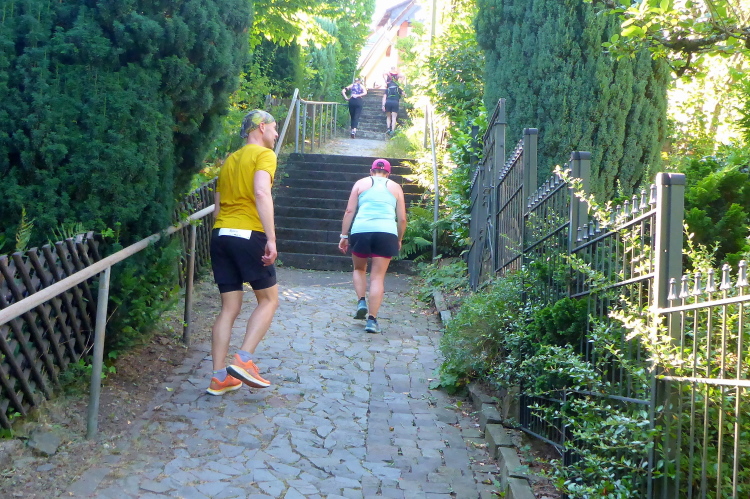 Hinter dem Finanzamt entlang steuern wir Summit No. 3 an, den Giersberg. Durch Dirks Streckencheck bin ich vorgewarnt, hier erwarten uns die meisten Treppen. Und so geht es gefühlte tausende nach oben, bis zum weithin sichtbaren Sendemast. Ebenso steil geht es auf der anderen Seite wieder bergab, nachdem wir den zweiten VP auf dem Gipfel passiert haben. Meine Frage nach dem bestellten Bier wird mit Gelächter beantwortet und ein kühler „Kranenburger Riesling“ muss genügen. Ich frage mich bei dem Abstieg, was die Beine heute mehr zerstört - die Treppen nach oben oder die nach unten….
