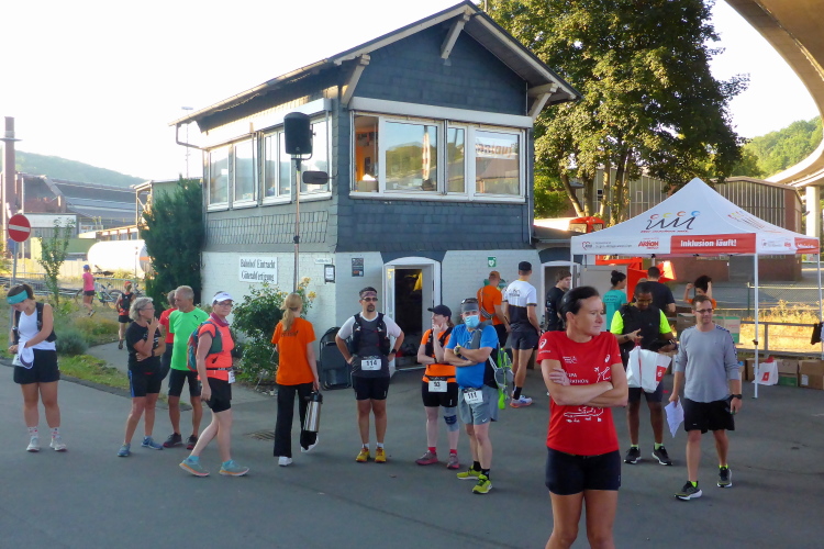 Die Startunterlagen werden Freitag und Samstag beim Kletterzentrum des DAV ausgegeben. Für die Teilnehmer mit weiterer Anreise gibt es diese auch am Sonntagmorgen im Startbereich vor dem Anlauf Büro am Bahnhof Eintracht. Eine Einverständniserklärung mit Haftungsausschluss ist abzugeben. In 200 m Entfernung sind kostenlose Parkplätze an der Siegerlandhalle in ausreichender Anzahl vorhanden. Es stehen 300 Startplätze zur Verfügung, jeder bekommt seine minutengenaue Startzeit mitgeteilt, welche auch auf der Startnummer sichtbar ist. So gehen von 8 – 9 Uhr jede Minute 2-6 Läufer an den Start. Da die Laufstrecke nicht abgesperrt ist und auch durch das Stadtgebiet führt, wird so das ganze Feld entzerrt und auf eine Stunde verteilt. Es gehen über 220 Läufer an den Start. In der Zeit von 9 – 10 Uhr machen sich nochmal rund 300 Wanderer nach gleichem Prinzip auf den Weg. Im Zielbereich, rund 300 m vom Start entfernt, stehen Umkleidezelte zur Verfügung. In begrenzten Umfang können die Duschen des DAV Kletterzentrums am Effertsufer genutzt werden.