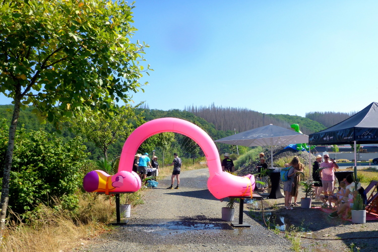Wieder im Tal der Weiss angekommen, beginnt zum Summit No. 6 der letzte lange Anstieg auf den Häusling. Zurückblickend erhalten wir hier den schönsten Ausblick auf die Siegener Oberstadt. Noch bevor wir oben sind, folgt VP 5 und wir freuen uns über ein weiteres Wasser. Über die Agnesenhofhütte des Sauerländischen Gebirgsvereins erreichen wir den vorletzten Gipfel. Nun geht’s bergab ins Leimbachtal mit dem bekannten Leimbachstadion. Im Gewerbegebiet Martinshardt passieren wir erst die Fa. Thielmann-Identica, um anschließend bei dem Gebäude „The Summit“ (das heißt wirklich so!) die Hot-Spot-Red-Bull-Power-Station zu erreichen, welche auch der letzte VP ist. Ein Flamingo sorgt für einen Regen und die letzte große Abkühlung. Ich verliere wieder Zeit, gehe aber gut gekühlt die letzte Steigung an.
