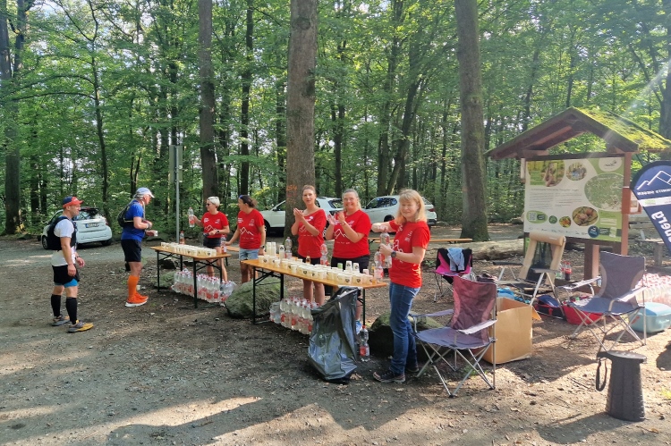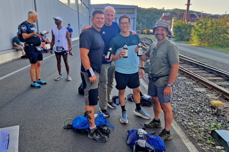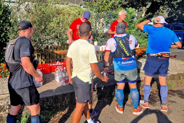Los geht es um 8 Uhr am Samstag, der Marathon startet zuerst. Das Wetter ist erst einmal optimal, blauer Himmel und 20 Grad. Die rund 130 Läufer laufen alle bis 8:30 jede Minute in kleinen Gruppen los. Danach die 25-km-Läufer und die 25-km-Wanderer (einige genehmigen sich schon vor der Strecke ein Bierchen), denen man später teilweise unterwegs begegnet. Dadurch verteilt man sich recht gut auf der Strecke, trifft aber auch immer mal wieder jemanden, anders als bei Läufen, wo sich das Feld entsprechend der Laufgeschwindigkeit eher kontinuierlich auseinanderzieht und man nach ein paar Stunden niemanden mehr zu Gesicht bekommt.