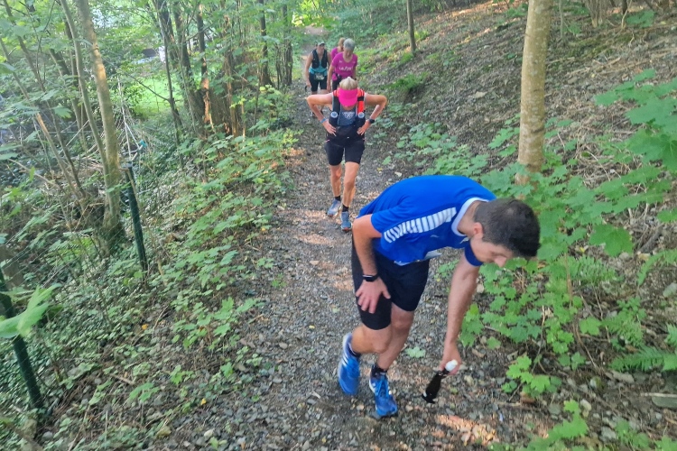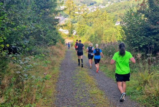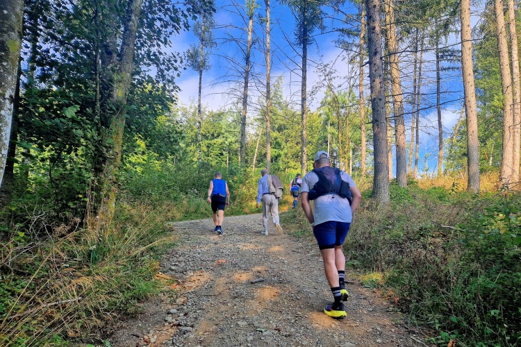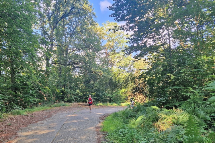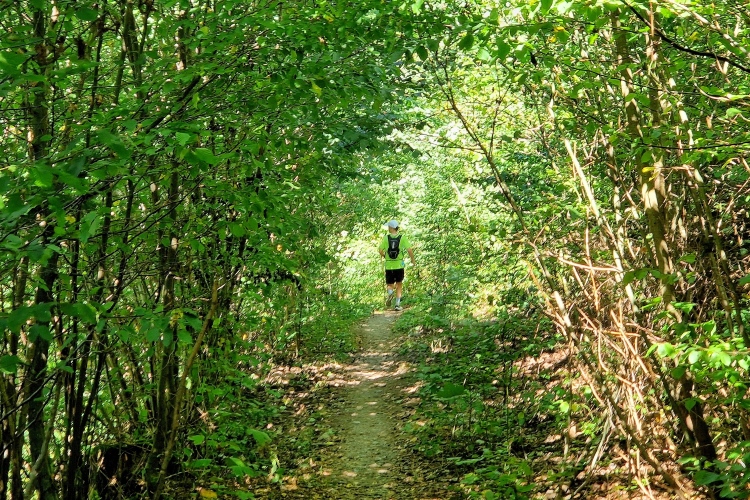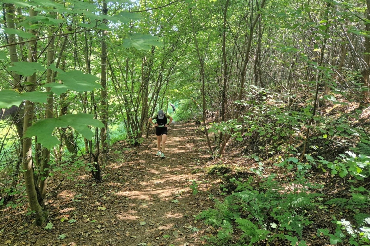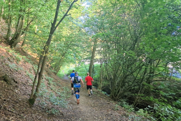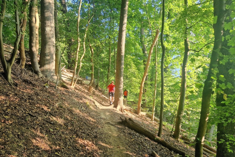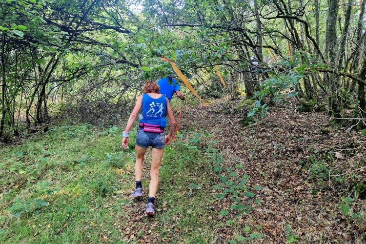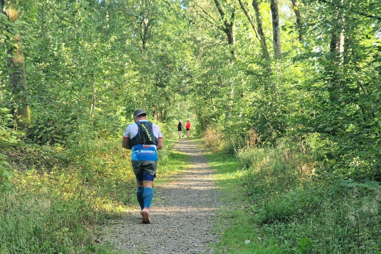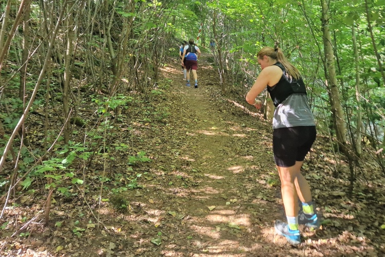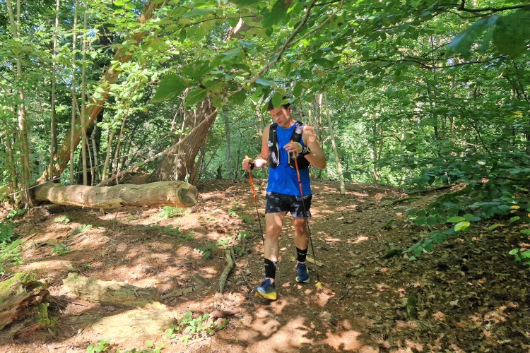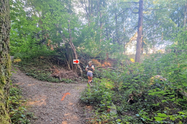 Etwa ein Drittel der Strecke verläuft auf Asphalt, der Rest weitgehend auf langsam ansteigenden und abfallenden Waldwegen, einige kürzere Abschnitte auf Trampelpfaden. Vermutlich kann man als gut trainierter Athlet fast die gesamte Strecke laufen, die meisten, so wie ich, gehen aber bergauf und können dann bergab ganz gut Gas geben. Stöcke braucht man nicht, auch wenn einige wenige Läufer und noch mehr Wanderer diese dabei haben. Traillaufschuhe braucht man auch nicht unbedingt, auf den Waldwegen sind sie aber ganz angenehm.