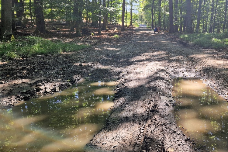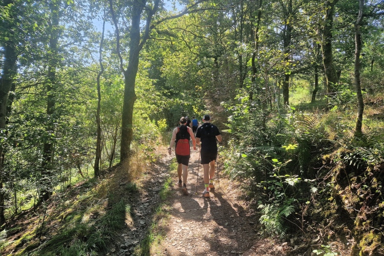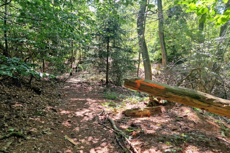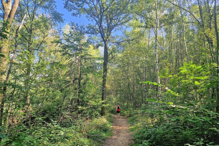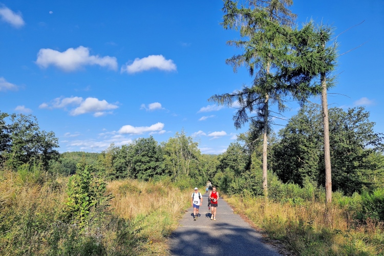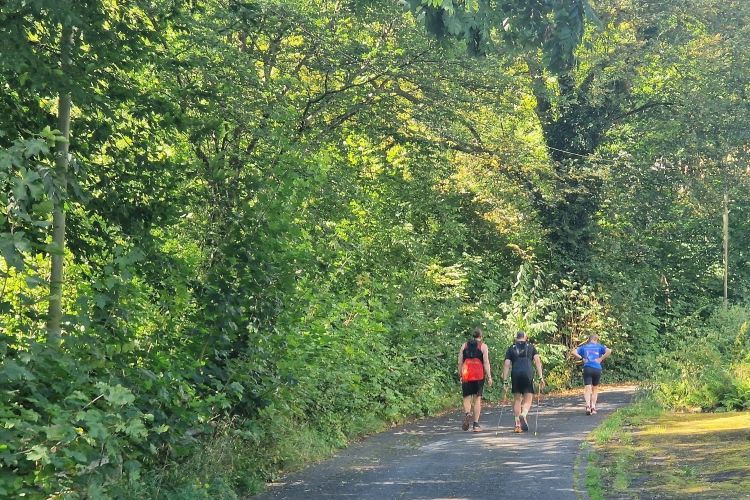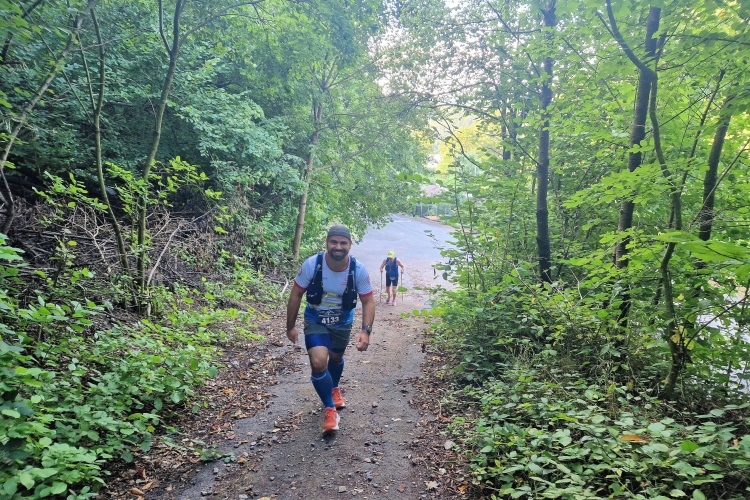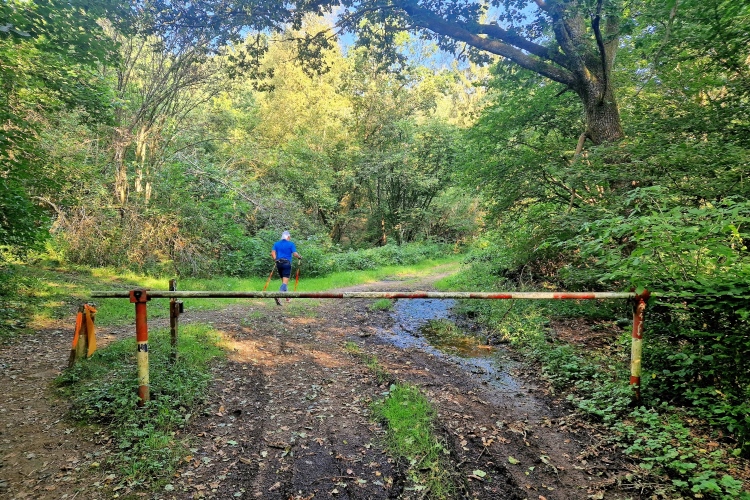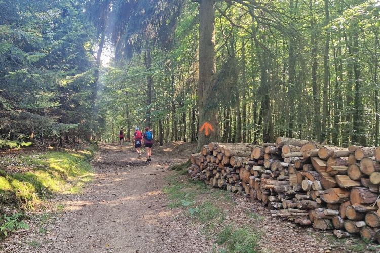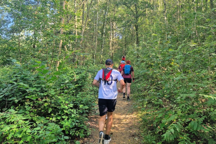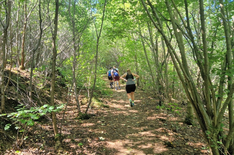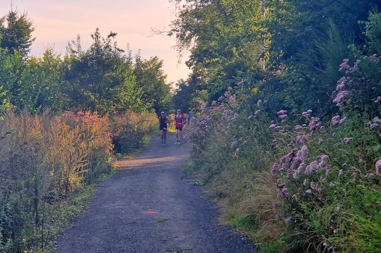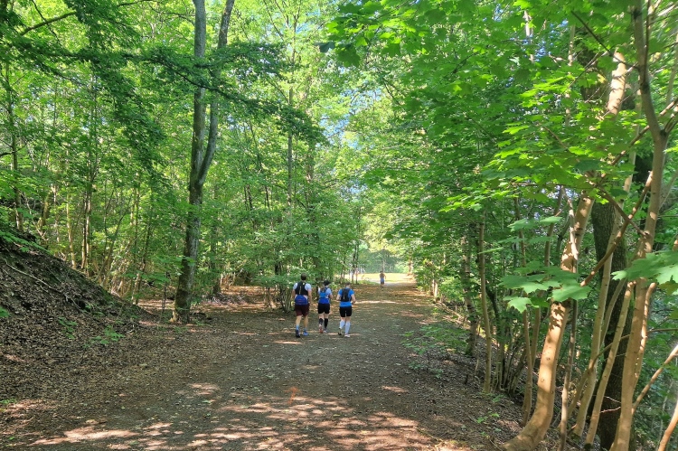 Etwa ein Drittel der Strecke verläuft auf Asphalt, der Rest weitgehend auf langsam ansteigenden und abfallenden Waldwegen, einige kürzere Abschnitte auf Trampelpfaden. Vermutlich kann man als gut trainierter Athlet fast die gesamte Strecke laufen, die meisten, so wie ich, gehen aber bergauf und können dann bergab ganz gut Gas geben. Stöcke braucht man nicht, auch wenn einige wenige Läufer und noch mehr Wanderer diese dabei haben. Traillaufschuhe braucht man auch nicht unbedingt, auf den Waldwegen sind sie aber ganz angenehm.