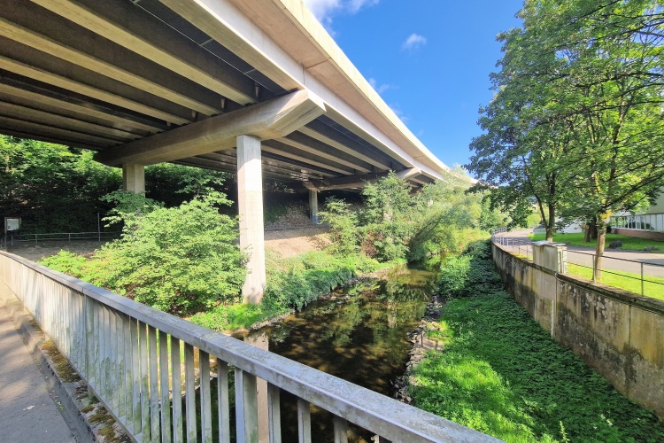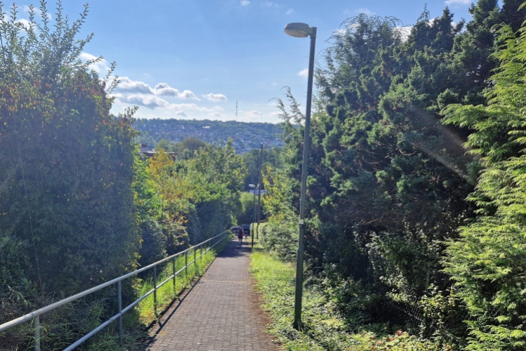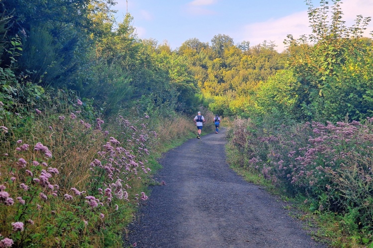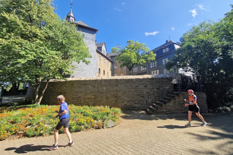 Auf dem Weg gibt es neben vielen Blumen (auffälliges Drüsiges Springkraut in kräftigem Pink) schöne Aussichtspunkte, Fachwerkstadtteile, Kirchen, moderne Industriegebäude und einen Kreativpark zu sehen und ein sehr gepflegtes Schloss. Wie gesagt, sehr abwechslungsreich. Es sind auch einige Zuschauer an der Strecke, meist wandernd oder vor ihren Häusern, was zusätzlich motiviert. Insgesamt war die Stimmung sehr entspannt (vielleicht auch, weil ich so weit hinten war?), man kam mehr ins Gespräch als ich das sonst so beim Laufen erlebt habe.