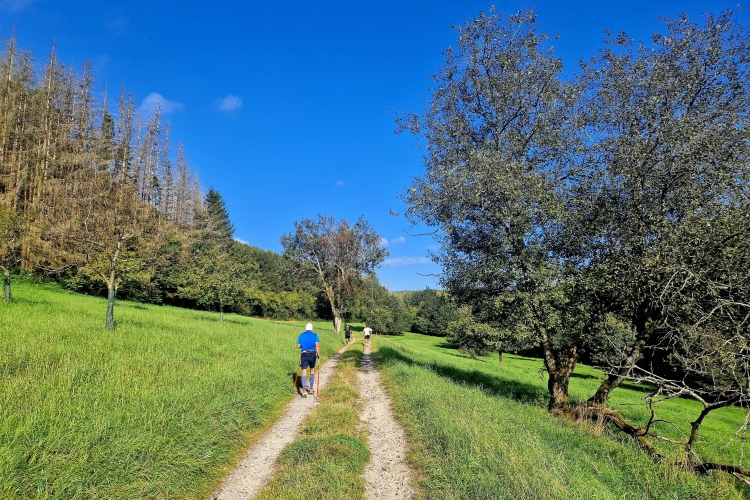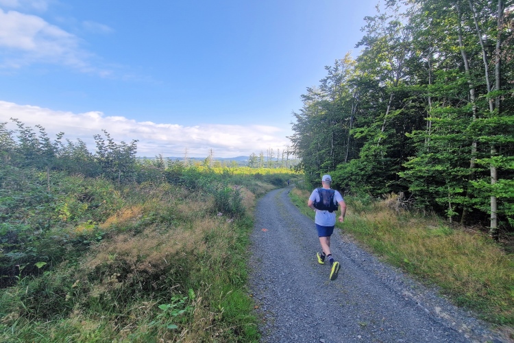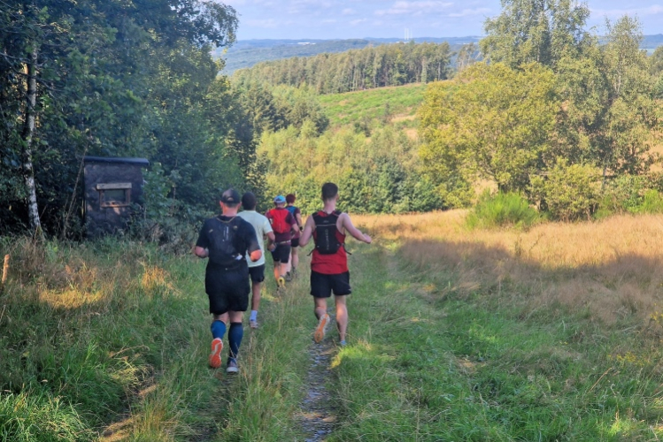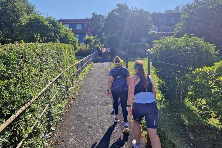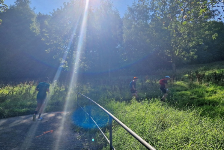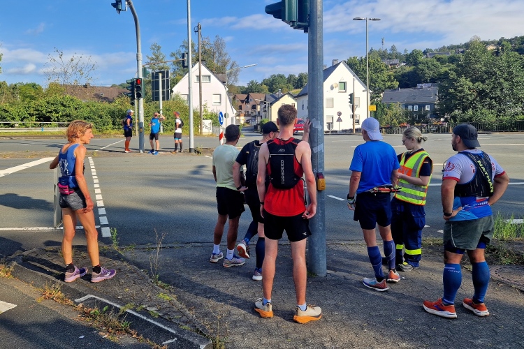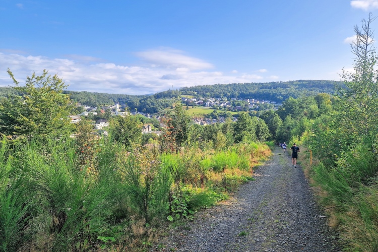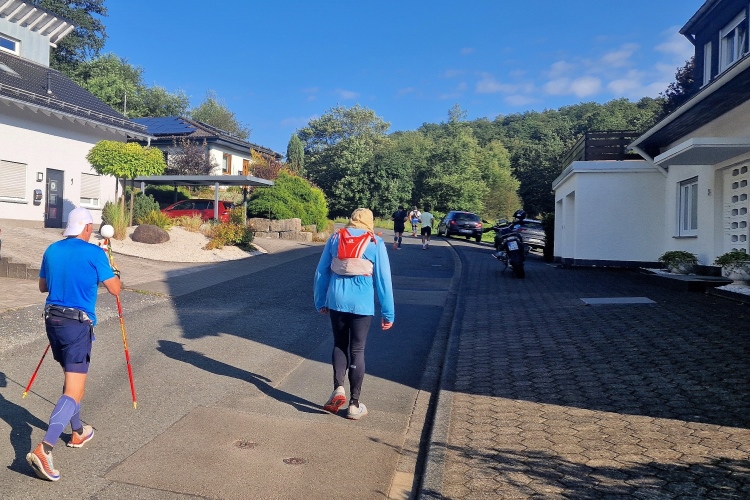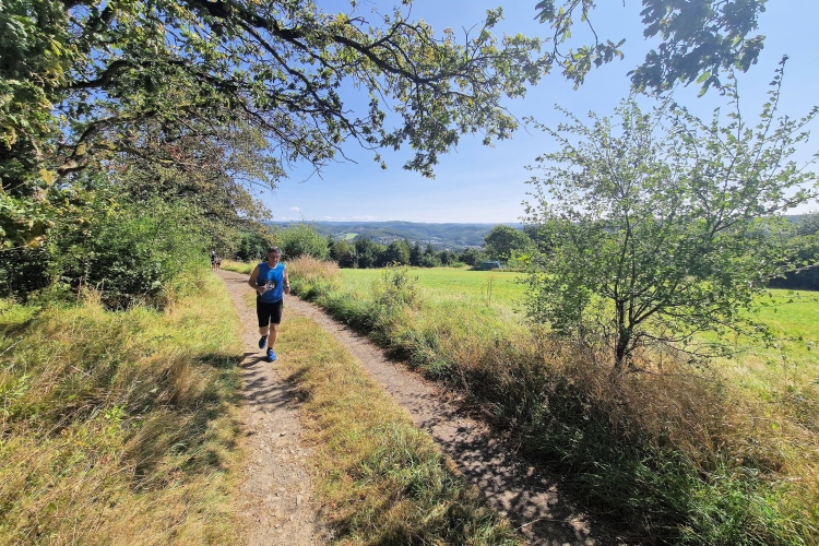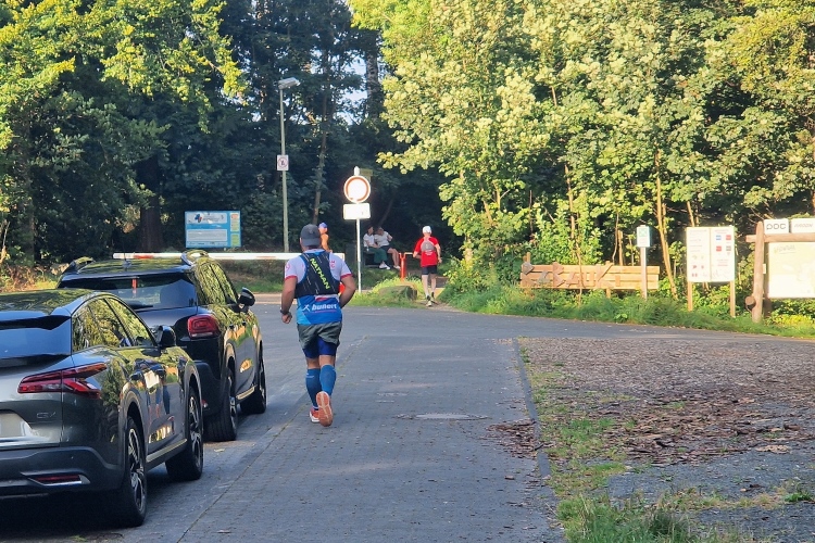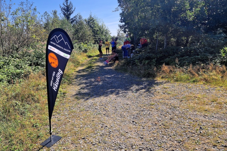 Start und Ziel liegen in der Nähe der Siegerlandhalle, also in der Stadt. Da diese aber recht klein und eng von Bergen umfasst ist, ist man schon nach wenigen Minuten im Grünen. Glücklicherweise ganz gut bewaldet, denn es wird langsam wärmer. Bis mittags ist es dann 34 Grad und auf den Strecken durch die Wohngebiete und im letzten Drittel durch flache, sturmentwaldete Hochebenen wird es richtig heiß. Die Strecke wird im Uhrzeigersinn durchlaufen, man hat also immer das Gefühl, dass die Sonne irgendwo von Vorne kommt. Die Sonnenschutzkappe ist daher neben den Schuhen das einzige weitere elementare Kleidungsstück.