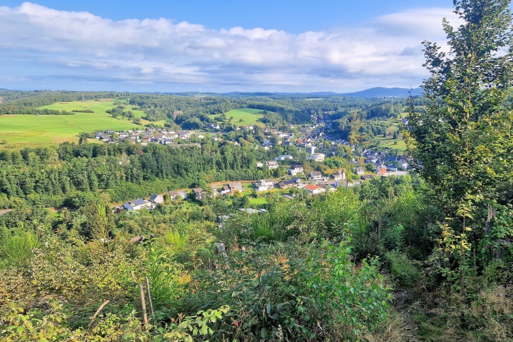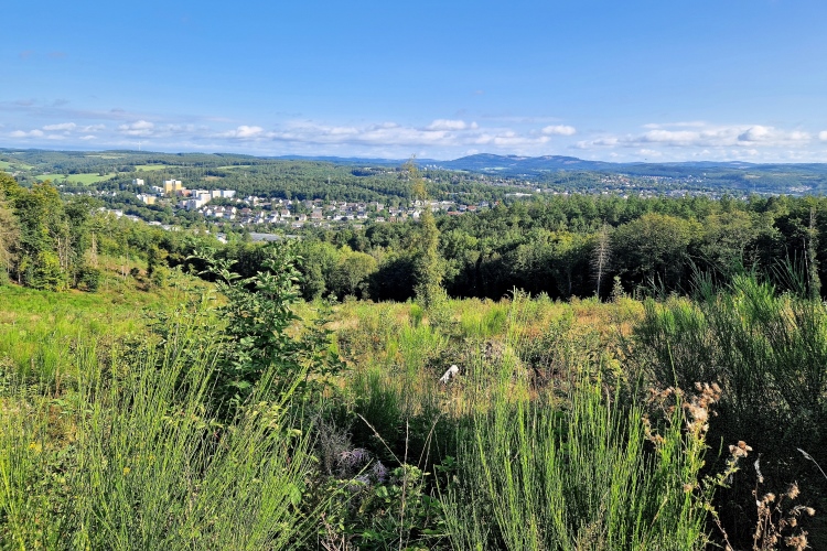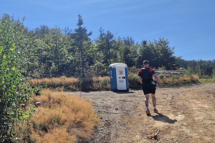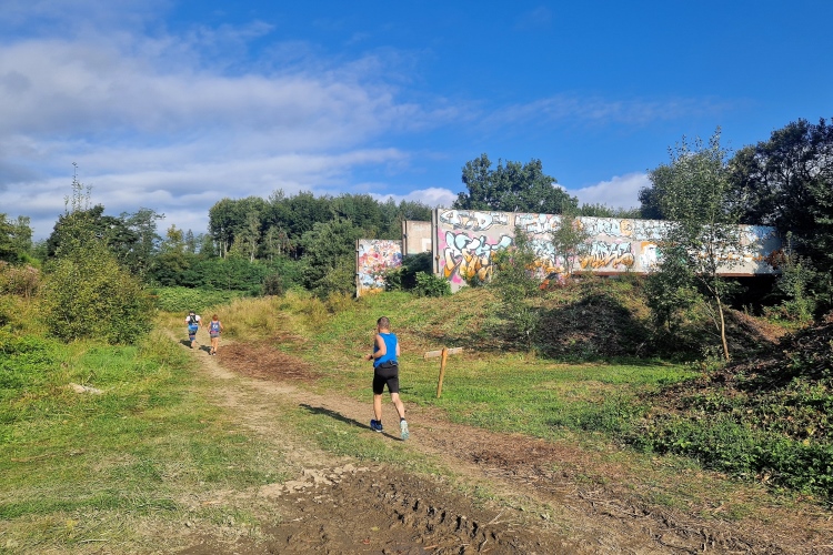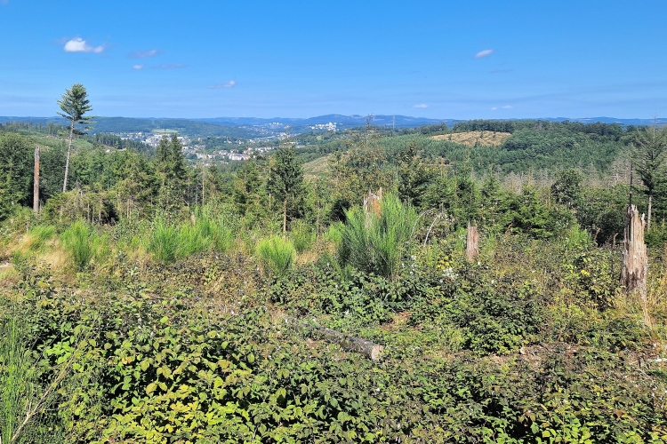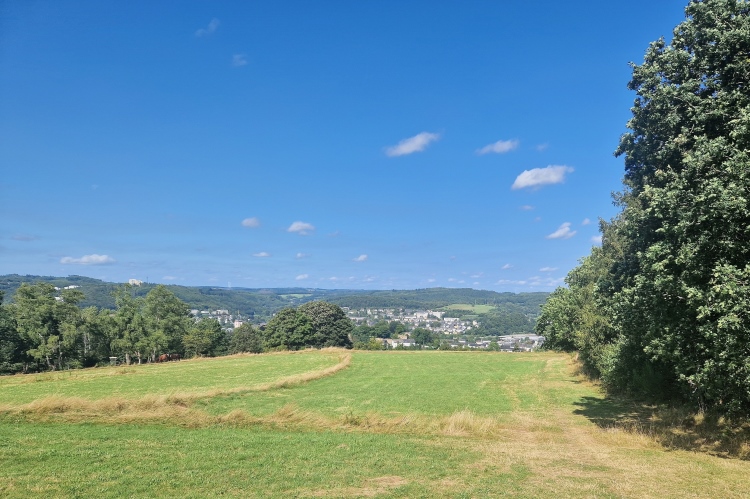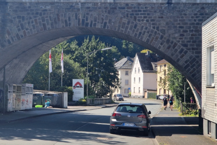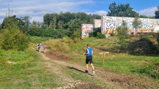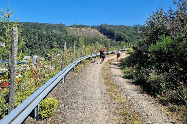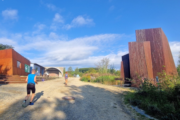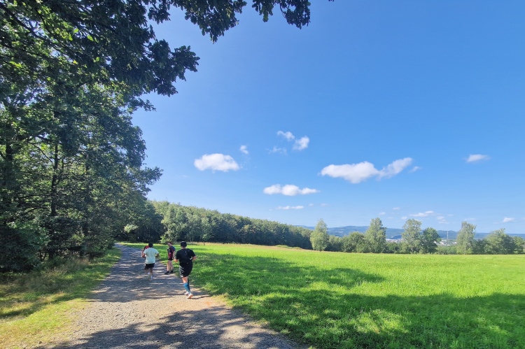 Start und Ziel liegen in der Nähe der Siegerlandhalle, also in der Stadt. Da diese aber recht klein und eng von Bergen umfasst ist, ist man schon nach wenigen Minuten im Grünen. Glücklicherweise ganz gut bewaldet, denn es wird langsam wärmer. Bis mittags ist es dann 34 Grad und auf den Strecken durch die Wohngebiete und im letzten Drittel durch flache, sturmentwaldete Hochebenen wird es richtig heiß. Die Strecke wird im Uhrzeigersinn durchlaufen, man hat also immer das Gefühl, dass die Sonne irgendwo von Vorne kommt. Die Sonnenschutzkappe ist daher neben den Schuhen das einzige weitere elementare Kleidungsstück.