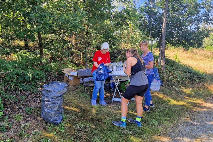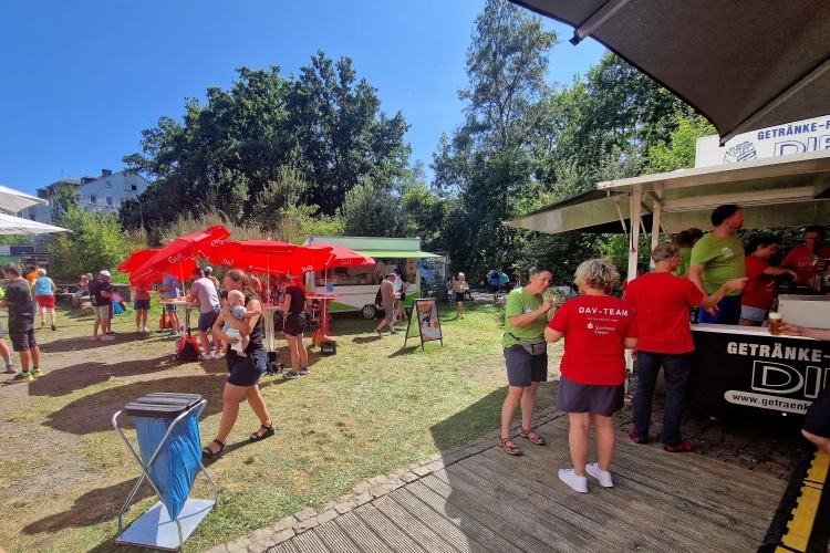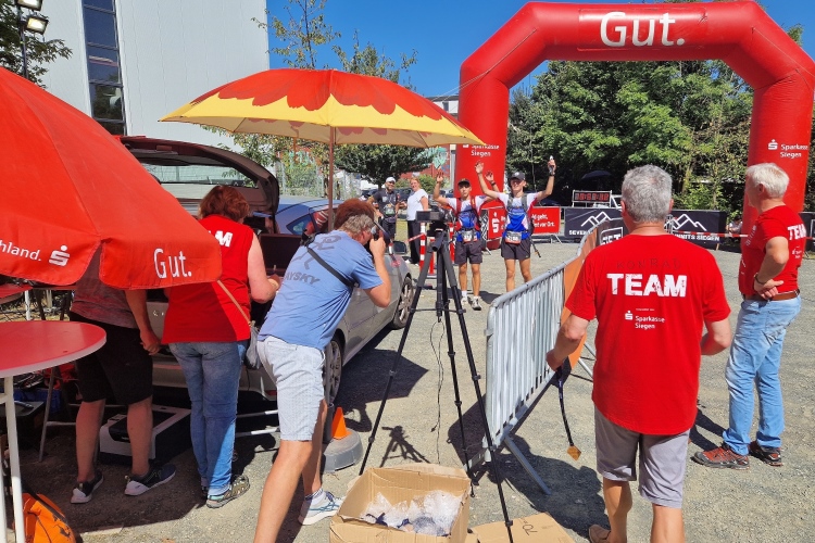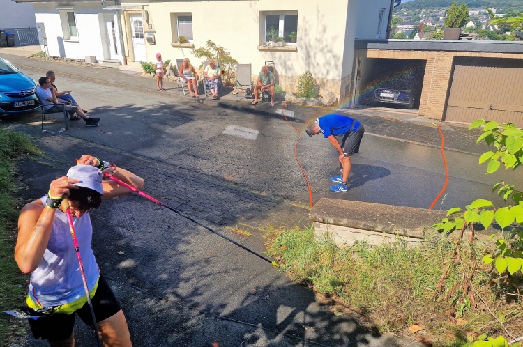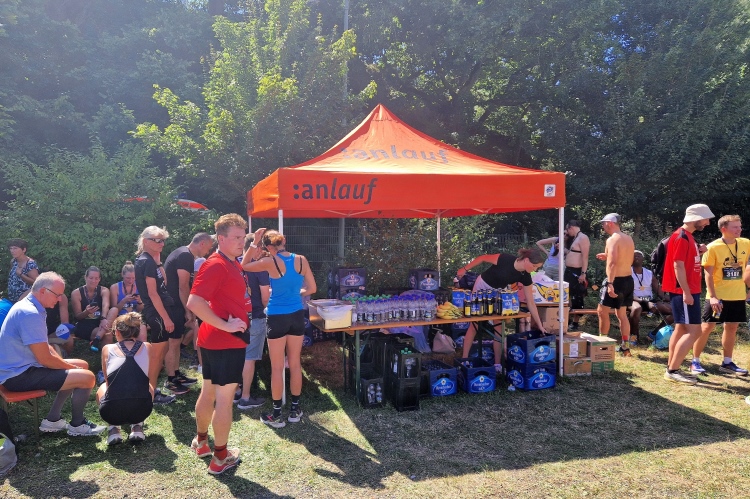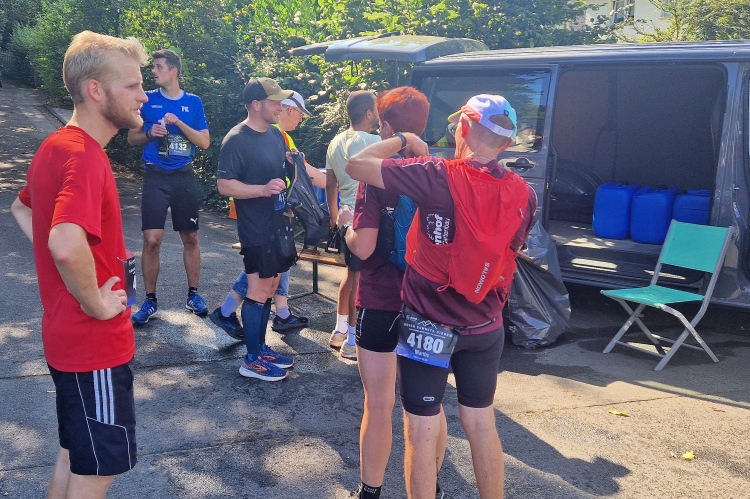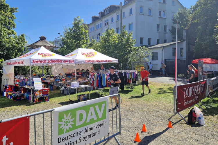Der Lauf ist wirklich sehr professional aufgesetzt, vom Veranstalter :anlauf Siegen und der DAV Sektion Siegerland. Alpenverein hört sich immer gut an. Es sind reichlich Sponsoren dabei und daher jede Menge Rahmenprogramm. Für den Start bezahle ich 49 Euro, wovon 9 Euro als Spende an den DAV und die Waldgenossenschaften gehen, 5 Euro kommen als Verzehrgutschein zurück (für mich ein sehr leckeres Schnitzelbrötchen), und es gibt ein Dose Gewürz für das Frühstücksmüsli. Und natürlich die sieben Verpflegungsstationen, und, weil es warm wird, drei weitere Stationen mit Wasser. Gut gemacht - für das, was geboten wird, ist das nicht zu viel. Zusätzlich kann man ein wirklich schickes Finisher-Shirt bestellen wenn man möchte, in Bio-Baumwolle oder Recycling-Funktionsmaterial, also wirklich hochklassig.