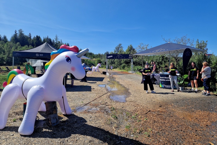 Auf Kilometer 35 dann die große Überraschung. Einhörner mit Regenbogenmähne als Sprühfontäne, dazu Liegestühle, ein Abkühlzelt, eine große Grillstation. Man hätte gerne länger verweilt, aber das Bier und Essen für uns gab es ja erst am Ziel. Die Station ist wohl primär für die 50-km-Wanderer angelegt, die sich hier noch einmal für die letzten 15 Kilometer stärken können. Schöne Idee.