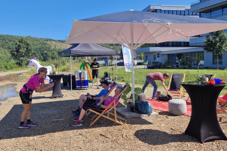 Der Zielbereich ist schön gemacht, Video von jedem einzelnen Einlauf, live Kommentar, Medaillen, Bier, Wasser, Grill etc. Und etwas Schatten. Auch hier wieder eine sehr gute Stimmung, gerade aufgrund des Wetters freuen sich alle – für sich und für die anderen – angekommen zu sein.