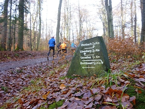 Der Orkan Xaver hat uns im Grenzgebiet südliches NRW/nördliches RLP glücklicherweise verschont, daher ist der heutige ausgiebige Waldlauf gefahrlos möglich. Sogar halbwegs mild ist es wieder geworden, eine Vermummung unnötig. Auch der Regen versiegt zwei Stunden vor dem Start und ermöglicht uns daher einen zumindest von außen trockenen Lauf. Viele liebe Bekannte werden getroffen, der konkurrenzlose Termin bringt zahlreiche Marathon-Junkies zusammen. Gute vierhundert von ihnen finden sich am Gangpferdezentrum zum Start ein, darunter auch unser Anton, den ich schon zu lange nicht mehr gesehen und gehört habe. Sprachlich verstehen tue ich ihn zwar immer noch nicht, unseren Neuburger aus der Nähe von Ingolstadt, dafür aber liegen wir auf einer Wellenlänge und darauf kommt es schließlich an! Bernd Neumann bewundere ich aufrichtig. Nach seiner schweren Operation im vergangenen Jahr hat er sich wieder mehr als berappelt, dies ist heuer sein dreißigster Marathon.