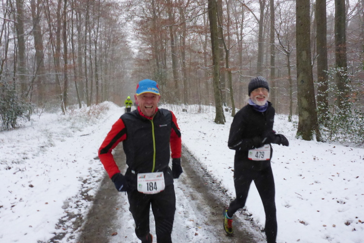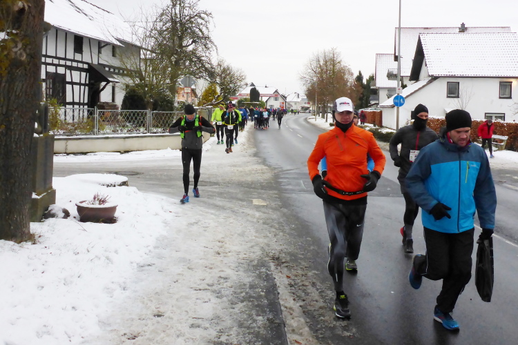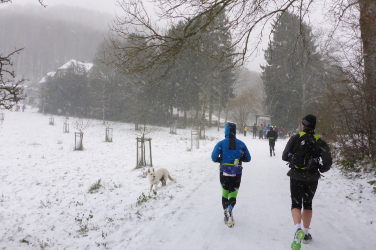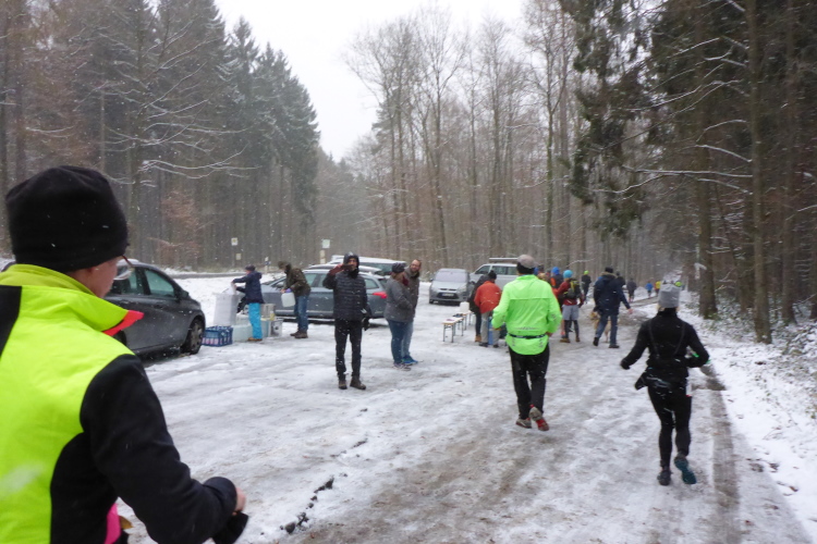 Wir wetzen über die Hauptstraße, am Bürgerhaus vorbei, in der Kurve zur Friedensstraße gibt es die ersten Rutschprobleme. Auf dem Laub im Wald wird es griffiger. Zuschauer, die am Start standen, erwarten uns unterhalb der Gangsportbahn, bevor wir endgültig in die dunklen Wälder des Siebengebirges abtauchen. Im Schmelztal ist die erste Verpflegungsstelle (km 5), viele kleine Schneeflocken und eine motivierte Helfercrew begrüßen uns hier.