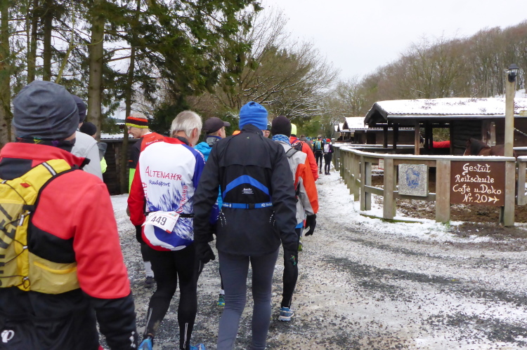 „Haaalt! Haaalt!“ brülle ich. Vier, fünf Läufer hören mich im kalten Heulen des Windes, die anderen laufen stur den falschen Weg ins Nirvana weiter. Wer richtig läuft, der hat nun das 14 Kilometer-Schild vor sich und blickt auf einen alten Bremsweg. Nicht für Läufer, sondern für Schlitten, mit denen das Gestein aus dem Steinbruch runter zum Rhein befördert wurde. Wieder am VP unterhalb der Löwenburg kommt der Eiswind nun aus dem Rheintal hoch, da hilft keine Kopfbedeckung mehr. Die durchgefrorenen Helfer kommen gut mit dem warmen Tee nach. Danke!