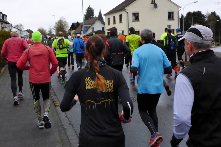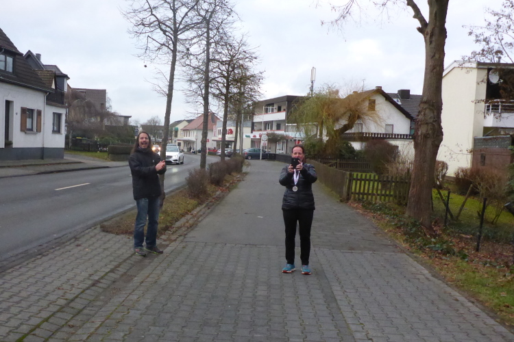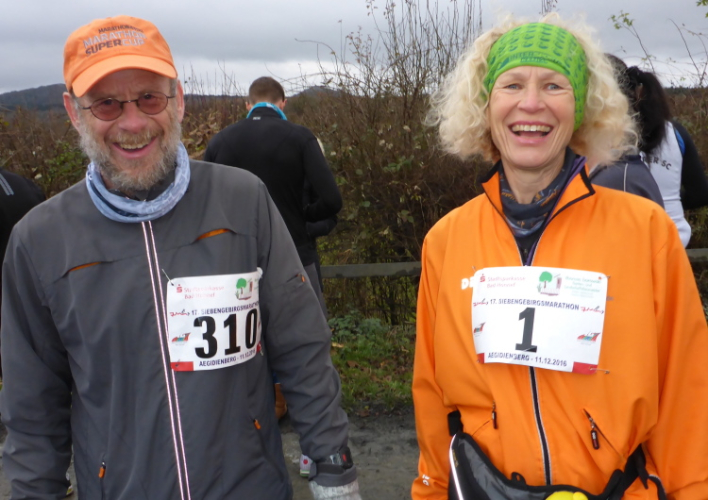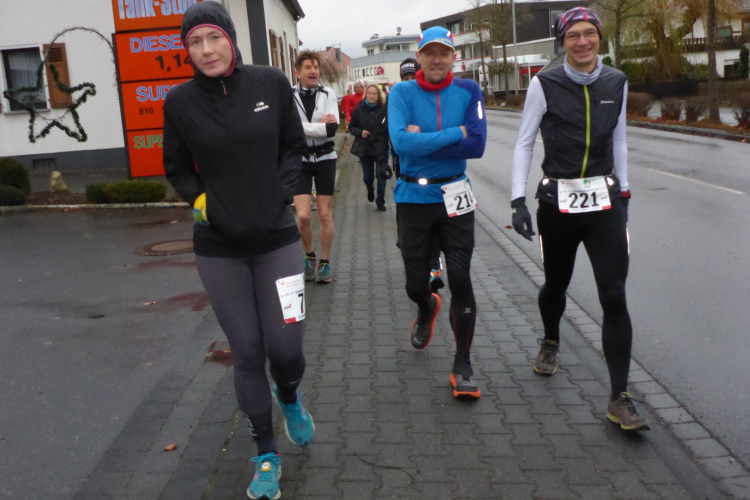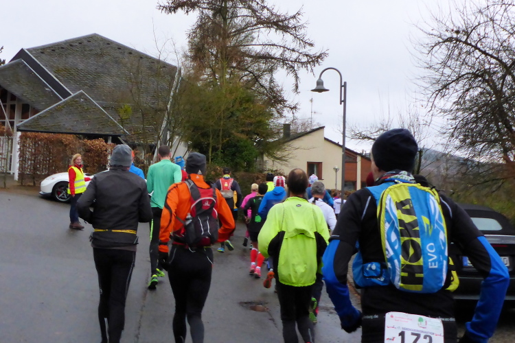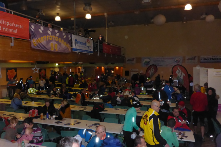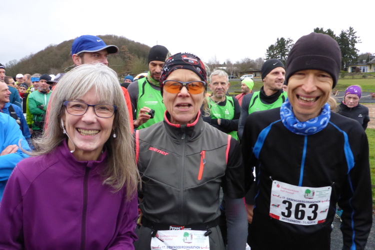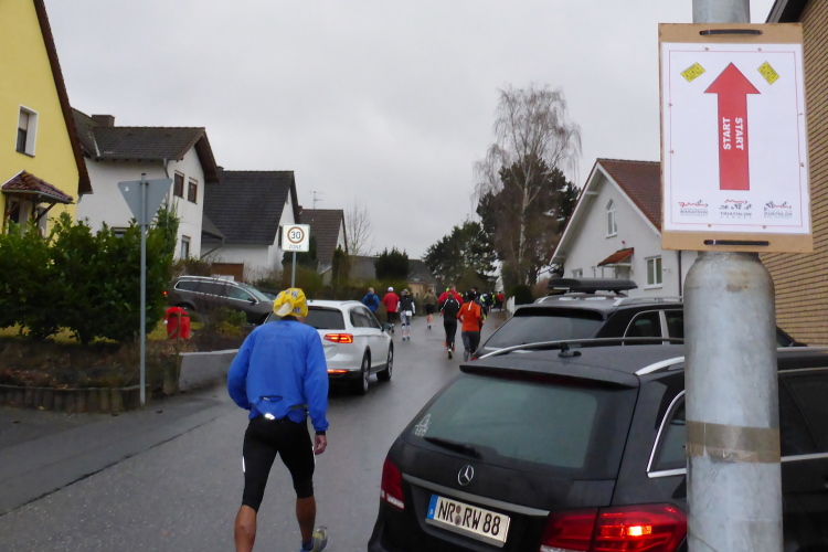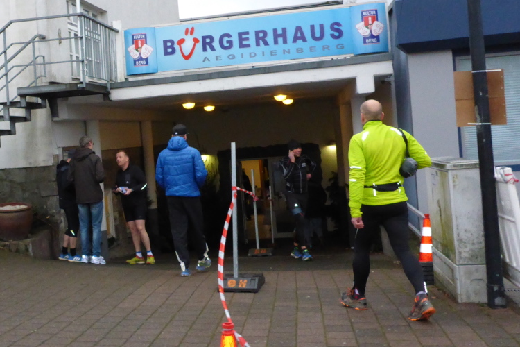 Der Siebengebirgsmarathon ist der schönste aller Wintermarathons in Deutschland. Mehrfach werde ich angesprochen, ich solle dies unbedingt erwähnen. Wenn sich die Halbmarathonläufer (Start 9 Uhr) zum Startort begeben, wird es ruhiger in der Halle, die Schlange vor dem Klo lichtet sich, bis irgendwann auch wir Marathonläufer Richtung Start (10 Uhr) dackeln.