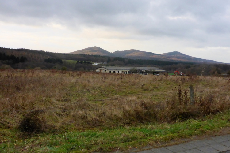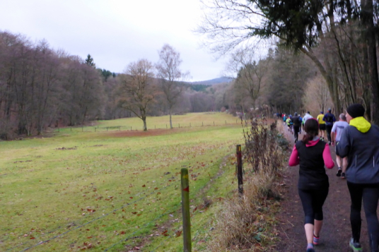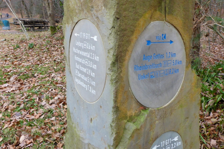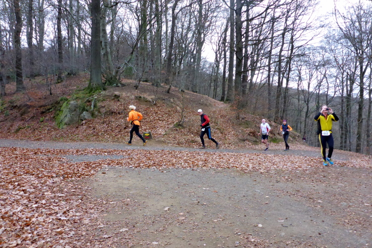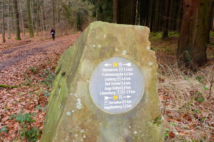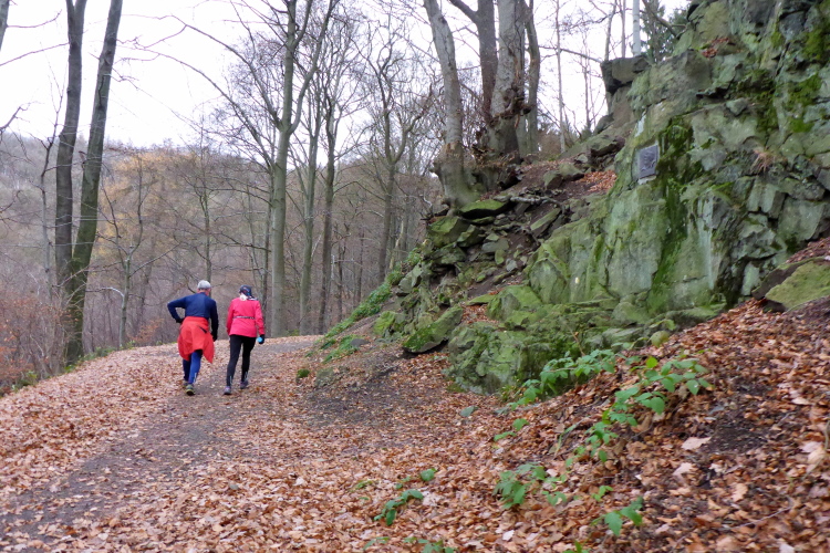 Wir überqueren das Schmelztal und die Halbmarathonmarke. Markant ist der Berg Himmerich, Riesenschiss genannt. Der Sage nach klopften einst Riesen ihre Spaten ab, als sie den Rhein aushoben. So entstand das Siebengebirge. Der Himmerich besteht also aus einem anderem Material, das sich hervorragend als Baumaterial nutzen ließ. Das wurde mittels eines Bremsberges ins Mucher Wiesental befördert, wobei sicherlich auch Bremsspuren entstanden.