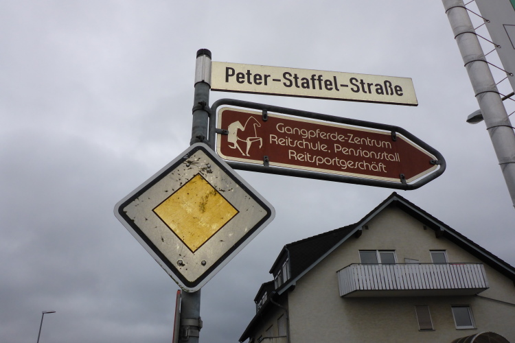 Der ist am Gangsportzentrum, das nicht nach uns, sondern nach den Pferden benannt ist. Aegidienberger nennt man die Pferderasse, die eine fünfte Gangart, das Tölten, eine Art Ultraschlappschritt beherrscht. Wir tölten in die Peter Staffel Straße ein. Peter Staffel wurde mit 18 Jahren das erste Opfer der Separatisten im Steinbruch von Himberg.