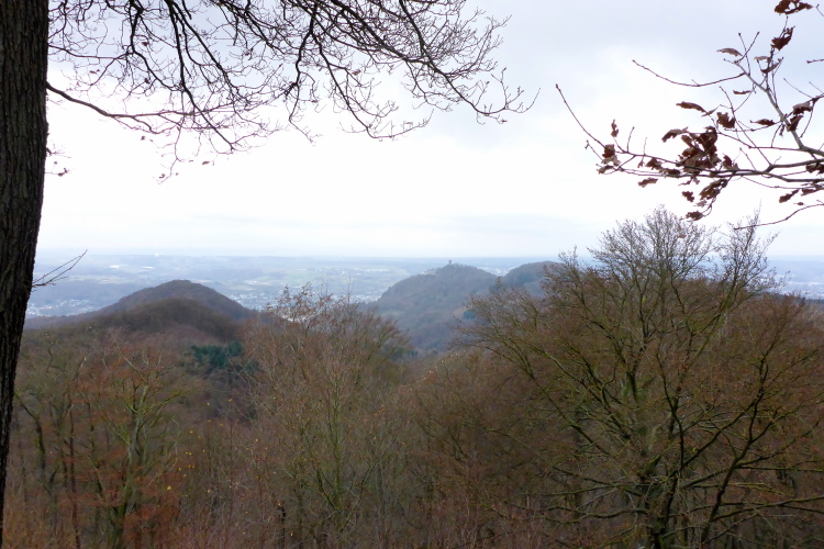 Wir können immer noch laufen, jetzt wieder hinauf zur Löwenburg, die wir nun umrunden. Zunächst kommen wir an einem Graben vorbei, aus dem das Baumaterial für die Burg gewonnen wurde und nun ein beliebter Grillplatz ist. Genau bei km 14 ist ein ausgeprägter Hohlweg erkennbar, der aus dem 12. Jahrhundert stammt und die Verbindung zum Rheinufer bildete. Die Löwenburg war nie wirklich bewohnt, weil Ritter Roland vor Fertigstellung schon in den Kreuzzug zog. Als man ihn für gefallen hielt, ging seine Verlobte ins Kloster der Ursulinen auf die Rheininsel Nonnenwerth. Als Roland aus dem Heiligen Land zurückkam, war sie schon mit Jesus verheiratet, wie man das Gelübde interpretierte. Roland erbaute eine neue Burg oberhalb von Nonnenwerth, um seine Geliebte sehen zu können. Von der Burg ist nur ein großer Fensterbogen geblieben, der Rolandsbogen.