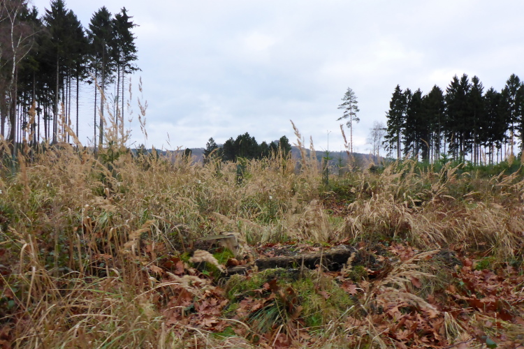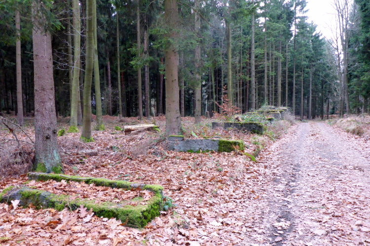 Ende der Träumerei, wir kommen nach zwei Kilometer zu einer der vier Abschussrampen der V1, die 1944 angelegt wurden, um die Brücke von Remagen (Ludendorffbrücke) zu schützen. Doch die Amis waren schneller, standen 600 Meter vor dieser Anlage. Damit die weltweit einmalige Raketentechnik nicht in deren Hände fällt, verlegte man die Anlage nach Berlin, wo sie aber auch zu spät ankam. Wir laufen nun auf asphaltieren Wegen, die angelegt wurden, um die Bauteile für die Raketenabschussrampen zu transportieren.