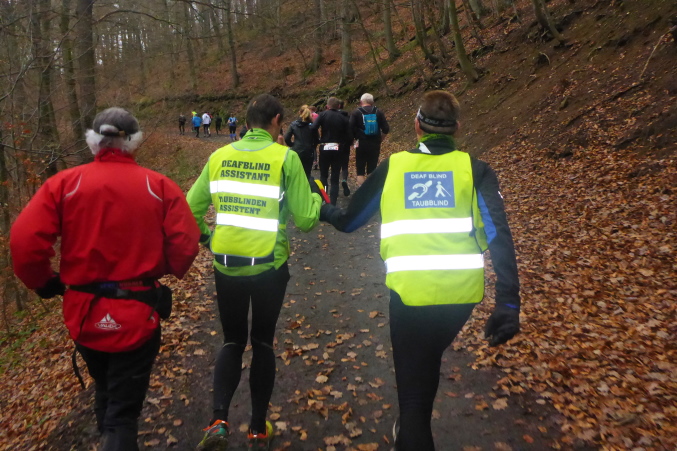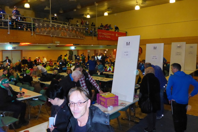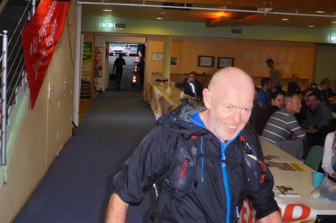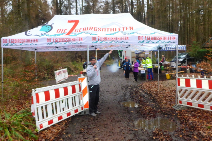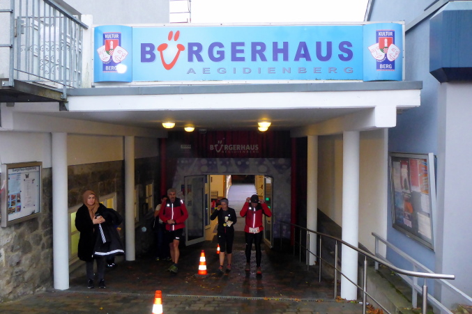 Aegidienburg ist zugeparkt, reichlich Halbmarathonis sind auf dem Weg zum Start um 9 Uhr. Wir Marathonis werden um 10 Uhr auf die Reise geschickt und haben noch etwas Zeit. Das Bürgerhaus ist heute der Dreh- und Angelpunkt: Startnummernausgabe, Verkaufsstand, Flyerauslage, kulinarische Versorgung und später Zieleinlauf, Verpflegung und Siegerehrung, alles unter einem Dach. Garantiert trocken! Vor dem Herren WC ist eine gigantische Schlange, bei den Damen ist es absolut leer. Ungewöhnlich! Ulli wechselt kurzerhand die Seiten. Er darf trotzdem als M starten. Kurzes Interview mit Tim Dally, er musste sich letztes Jahr dem Schotten Niki Johnstone geschlagen geben, der hier neuen Streckenrekord lief. Niki ist heute nicht da, Tims Lächeln zeigt, dass er viel vor hat.