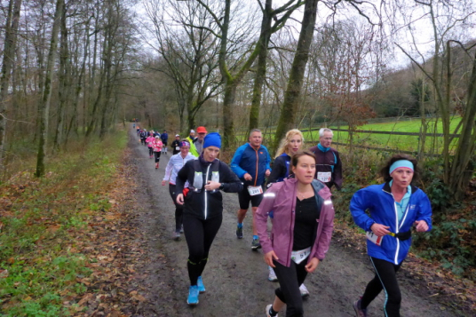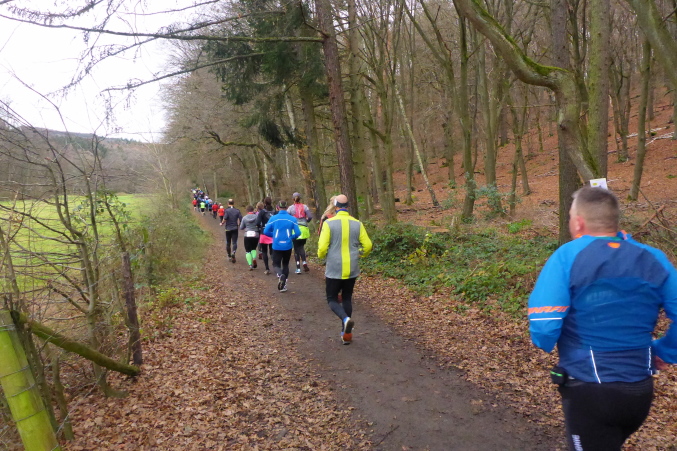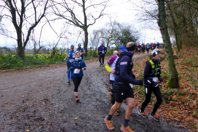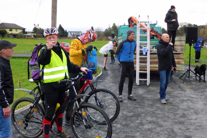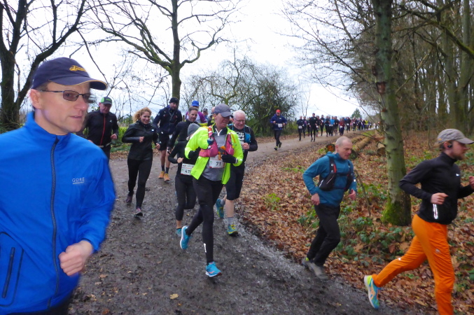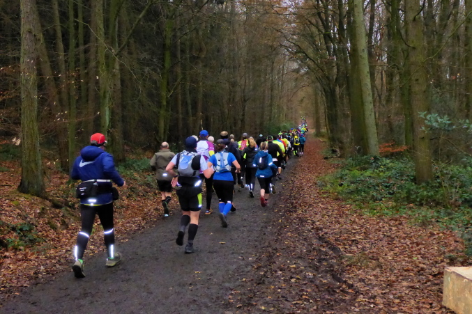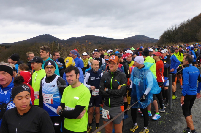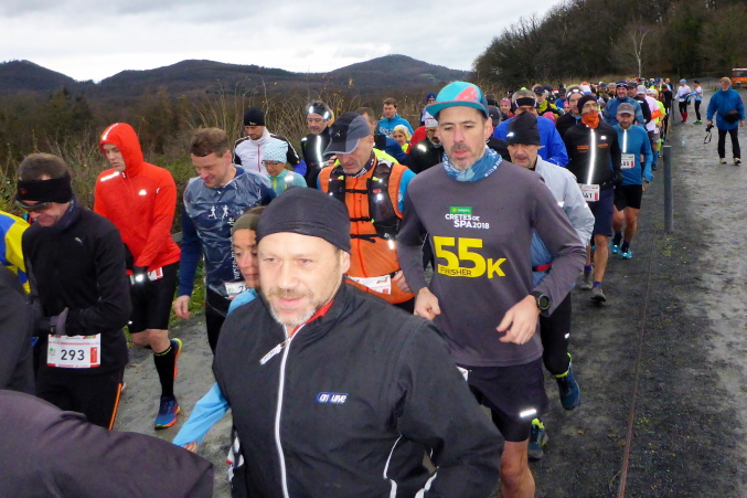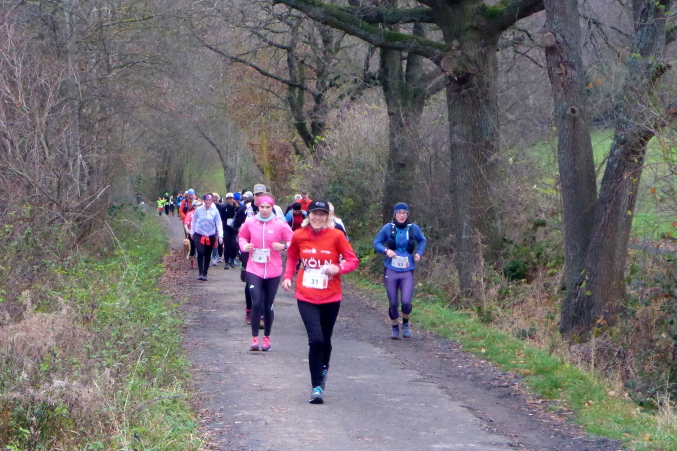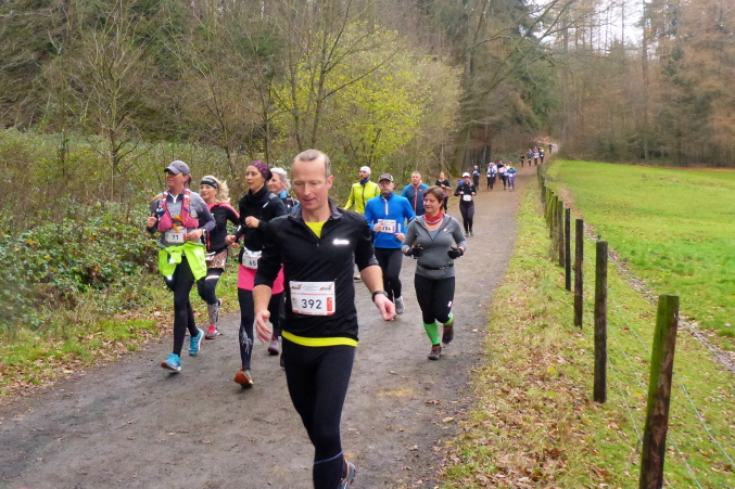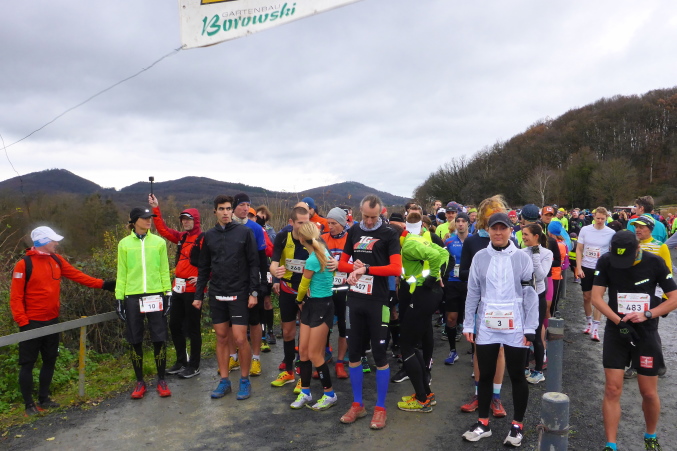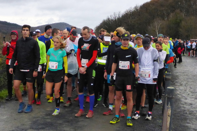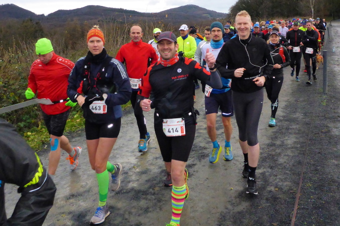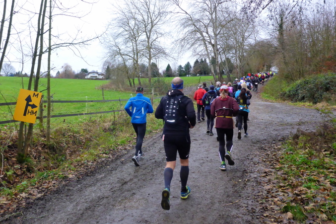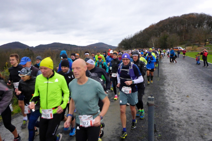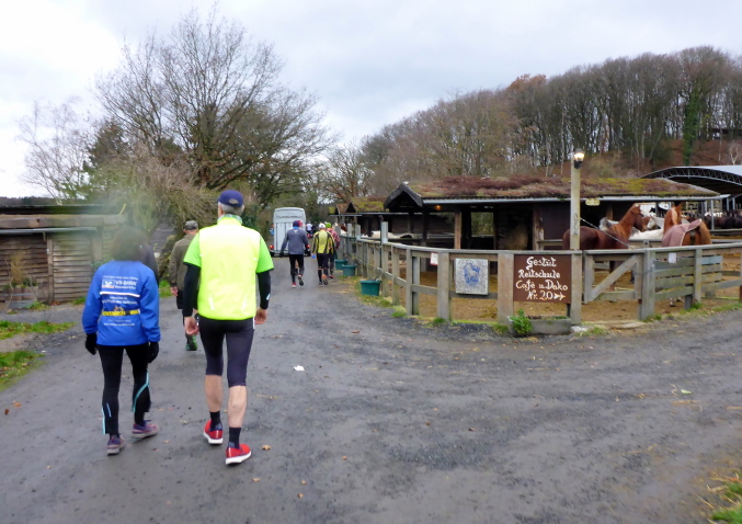 Der Start beim rund 400 m entfernten Gangpferdezentrum findet auf deren Ovalbahn statt, es ist genügend Platz, um alle Starter unter zu bringen. Hier boomt der Pferdesport. Viele Läufer stehen dicht gedrängt im Windschutz eines Schuppens, es pfeift doch ganz ordentlich bei erfrischenden 5 Grad. Das Startfeld füllt sich, warme Kleidung und Regenjacken überwiegen. Pünktlich geht es los und wir dürfen die Eroberung des Siebengebirges in Angriff nehmen.