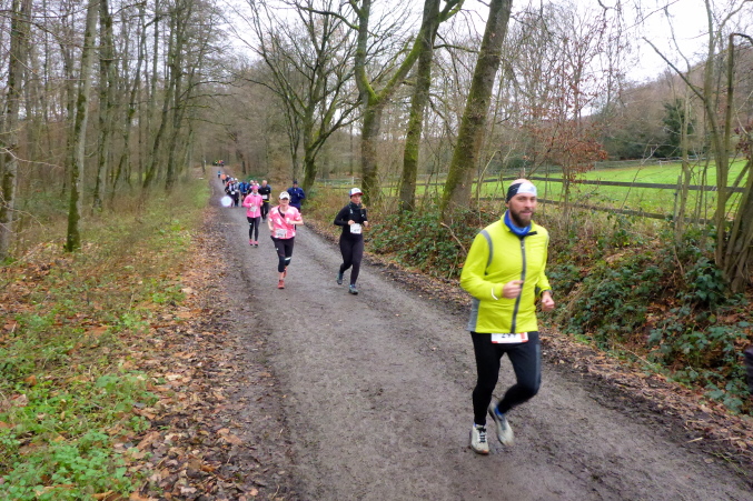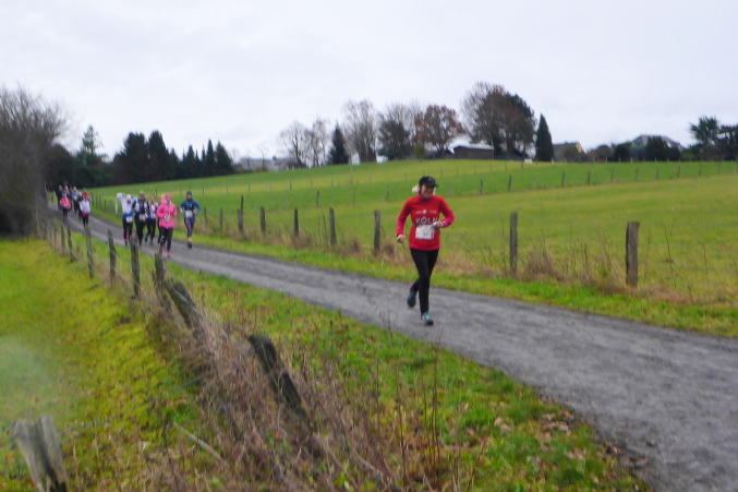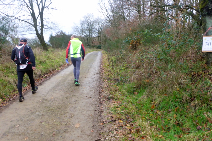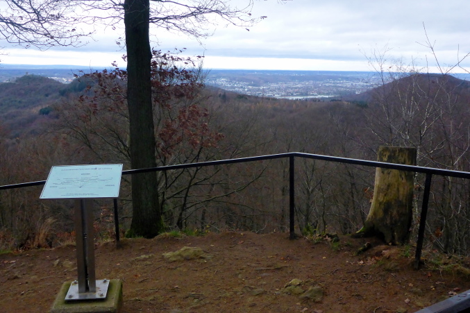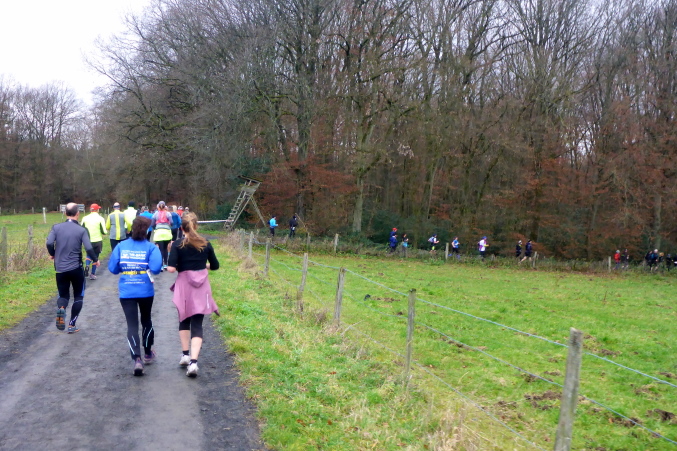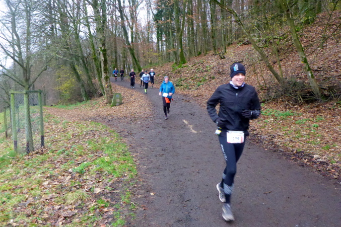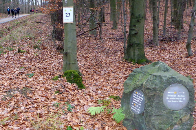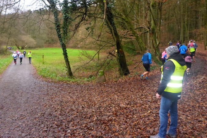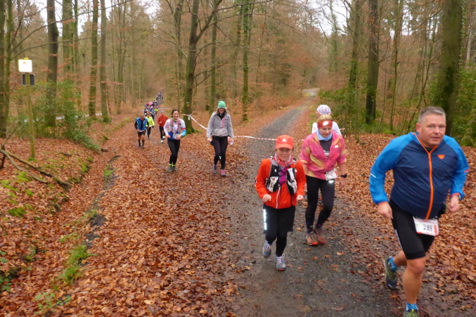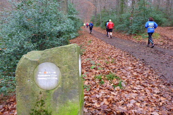 Wir klettern 3 km lang aufwärts bis zum Löwenburger Hof, an dessen Fuße bereits unser VP 2 +3 liegt. Aber erst einmal nur VP 2, es geht weiter bergauf Richtung Margarethenhöhe. Hier gilt es trotz des unebenen Laufbodens die Augen in die Ferne zu richten, traumhafte Ausblicke bis zum Rhein laden zum Schauen und Verweilen ein. Hinter Margarethenhöhe geben wir auf 2,5 km 100 HM wieder ab, nur um uns auf den nächsten 2,5 km 75 HM davon bis zum Löwenburger Hof zurück erobern zu müssen.