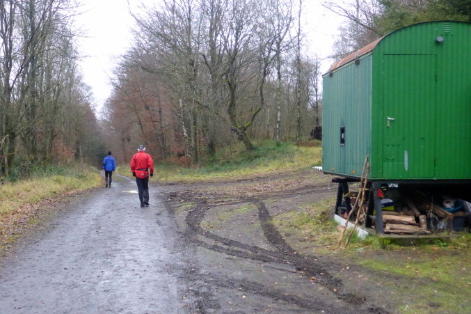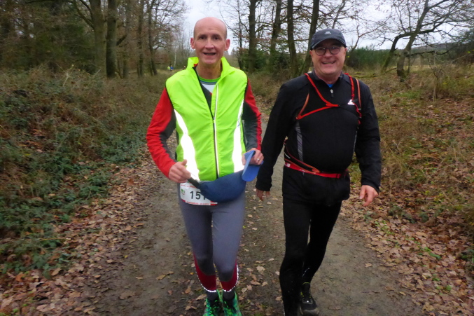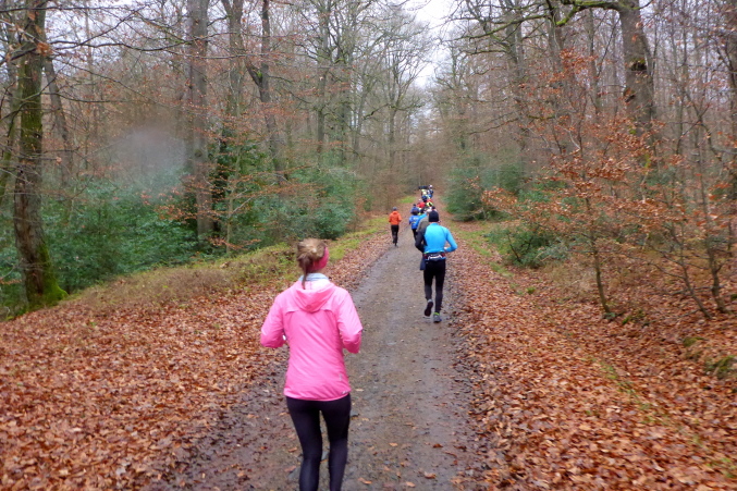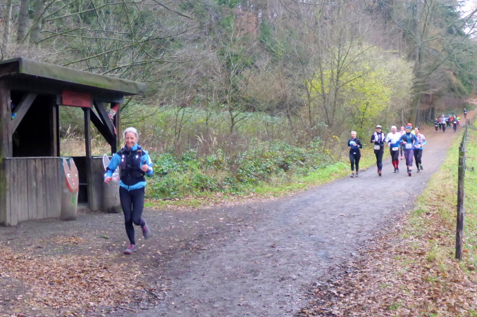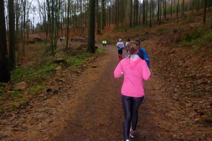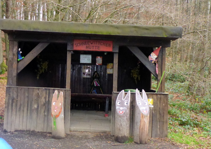 Es geht eine Runde durch den Ort, dann verlassen wir Aegidienberg, um in den Wald zu verschwinden. Roland taucht auf, sein Unfall mit der Bahn liegt zwei Jahre zurück und heute startet er endlich wieder auf der Marathon Distanz. Die Waldautobahnen sind durch den Regen aufgeweicht und teils sehr matschig. Abgesehen von kurzen Anstiegen rollen wir auf den ersten 5 km überwiegend bergab, vorbei an der Schneewittchen-Hütte (auch für Anette ein beliebtes Fotomotiv) und passieren den tiefsten Punkt der Strecke. Verena und ich wechseln ständig die Plätze, bergab fliegt sie an mir vorbei, in den Steigungen kann ich mich wieder zurück kämpfen.