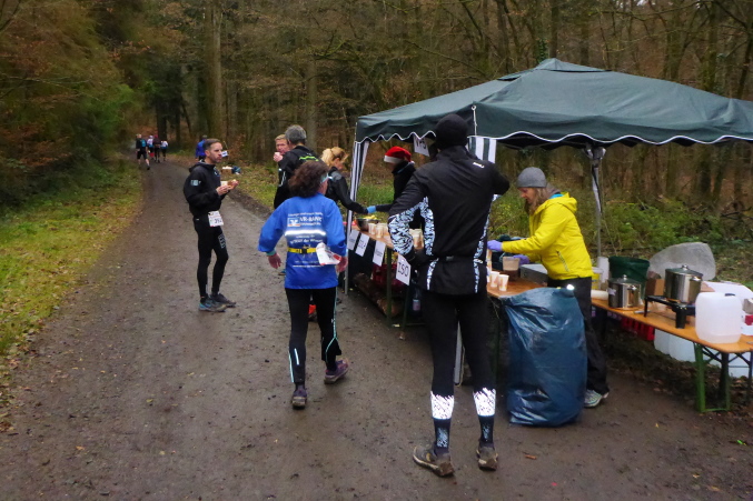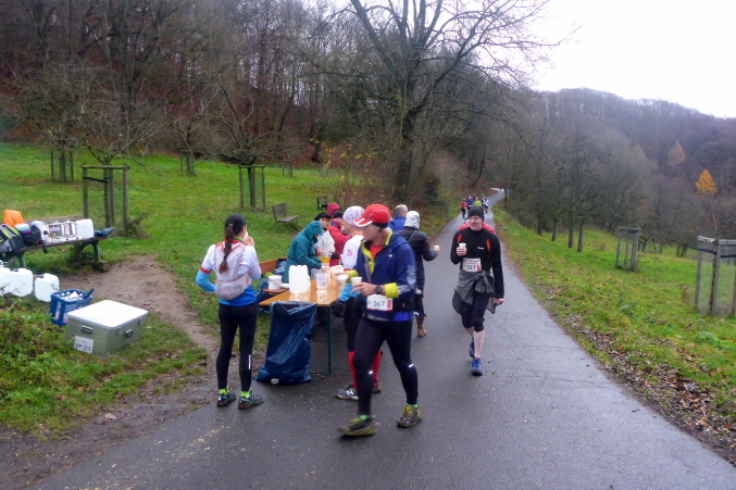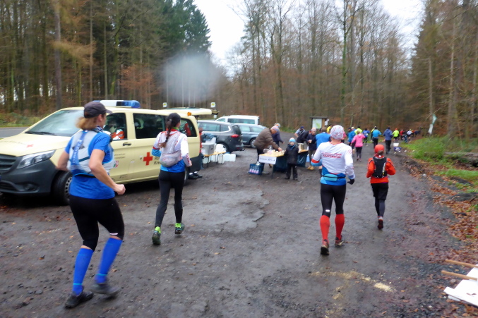 Der mittlere Abschnitt ist ein stetiger Wechsel zwischen hoch und runter, immer im Wald. Schön ist es hier im Siebengebirge! Jeder VP ist ein Highlight! Die halbe Distanz geht durch, wir umrunden den Leyberg. Ich finde einen Autoschlüssel. Niemand vermisst ihn bisher, ich bekomme kein Finder-Bier. Ich hoffe im Ziel kann ich jemanden glücklich machen. Am nächsten VP die einmalige Gelegenheit: Kühles Reissdorf Kölsch. Köstlich! Danke an den Spender, nächstes Jahr laufen wir das Ding zusammen.