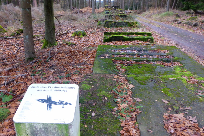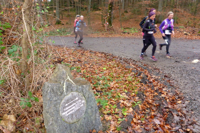 Mitten im Wald ein Denkmal aus finsteren Zeiten: Ein paar Betonklötze sind noch von ehemaligen Abschussrampen für V1 Raketen übrig. Die Bäume haben inzwischen den Berg friedlich zurück erobert. Hinter VP 7 beginnt der letzte Anstieg, wir müssen noch mal über 100 HM nach oben. Vorbei am berühmten grünen Bauwagen gilt es den Asberg zu umrunden. Einer der beiden Asberger Seen liegt wie verwunschen direkt an der Strecke. Jetzt heißt es endlich: Es geht nur noch bergab! O.k., fast, aber der kleine Anstieg ist jetzt echt zu vernachlässigen.