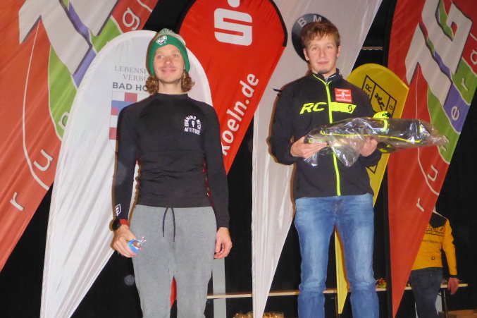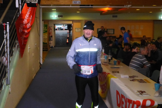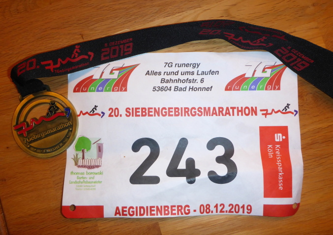 Die Pferdeweide umrunden, dann die letzten Kilometer durchs Wohngebiet. Die zweite Straßensperre wird von unserer Polizei perfekt dicht gemacht sobald sich ein Läufer nähert. Wir haben Asphalt und Pflaster unter den Füßen und schweben an der Hauptstraße entlang zurück zum Bürgerhaus. Die Rampe hinab und rein in die Halle, rauf auf den Teppich, Flutlicht blendet und ab durch den Zielbogen. Es ist geschafft, der 7G - 2019 gefinisht. Eine schöne Medaille ziert meine Brust, während auf der Bühne gerade die Siegerehrung beginnt. Ich bin pünktlich!