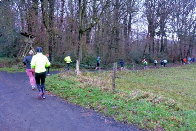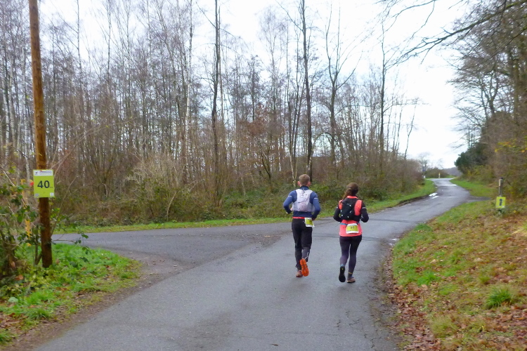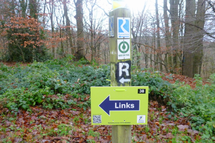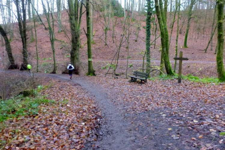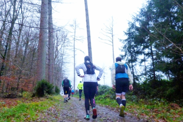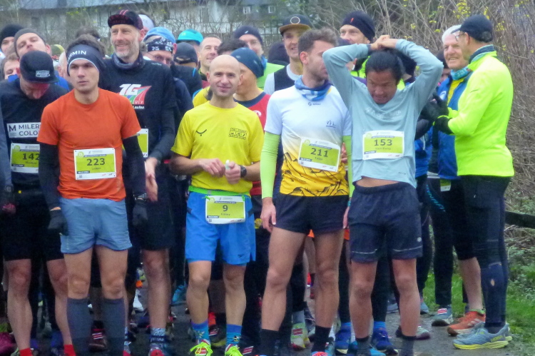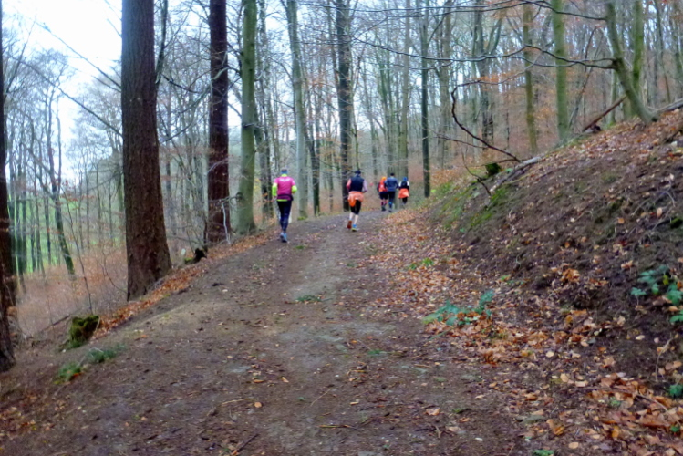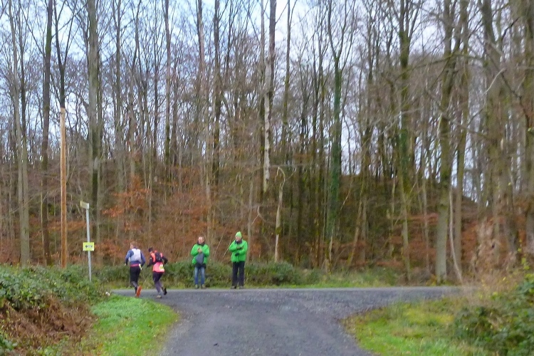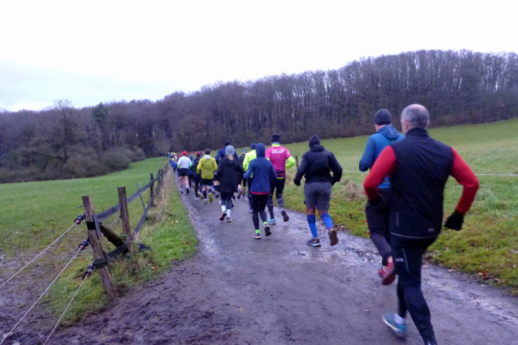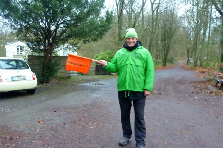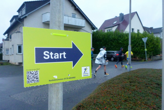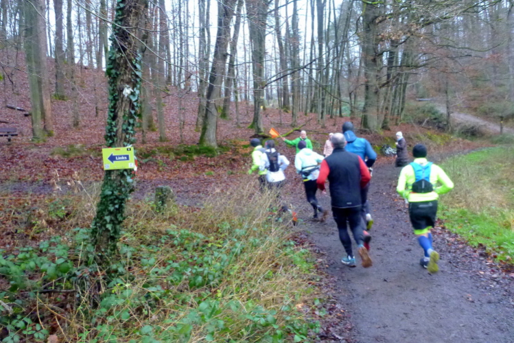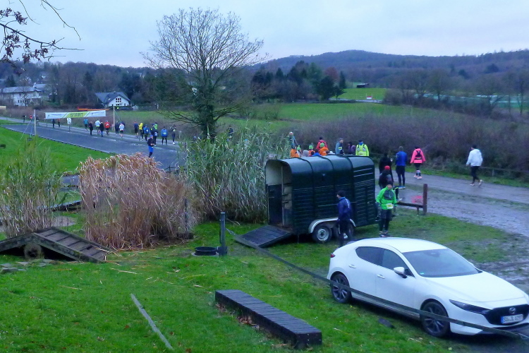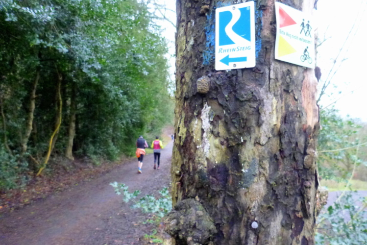 Ach, dann ist da noch eine Überraschung, denn am Start steht man verkehrt herum. Daß die Strecke leicht verändert wurde, hatte ich zwar läuten hören, diese Einzelheit jedoch noch nicht. Egal, diese Flexibilität besitze ich gerade noch. Über insbesondere von den nächtlichen Regenfällen ordentlich aufgeweichten und von tiefen Pfützen durchzogenem Untergrund kommen wir nach einigen Schlenkern auf den Stellweg. Erspart bleibt uns somit der kurze Auftakt durch Aegidienberg mit Inaugenscheinnahme des Km-Schildes 42, kaum daß ein paar hundert Meter zurückgelegt sind. Wegen ein paar Startfotos zunächst ganz hinten, beginne ich mich ganz langsam einige Plätze nach vorne zu arbeiten.