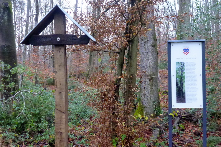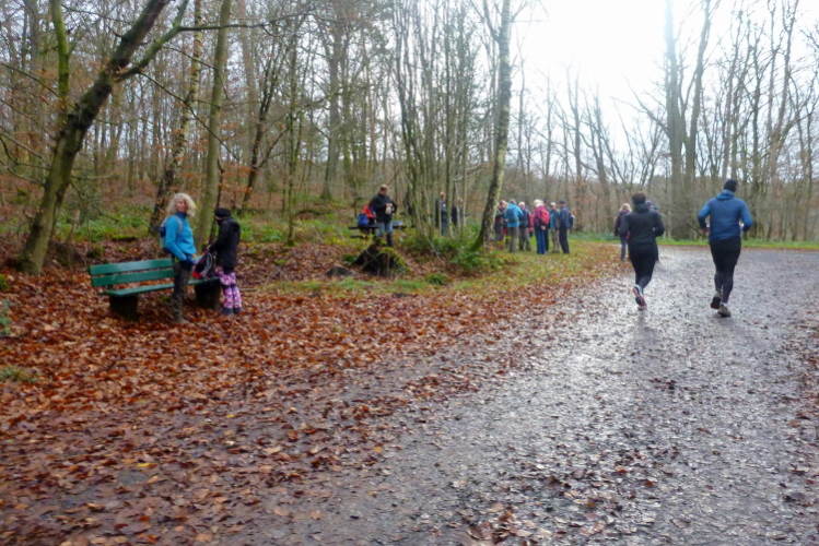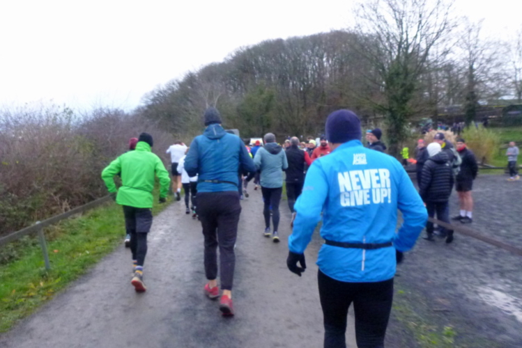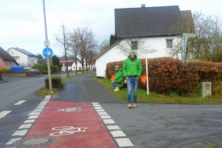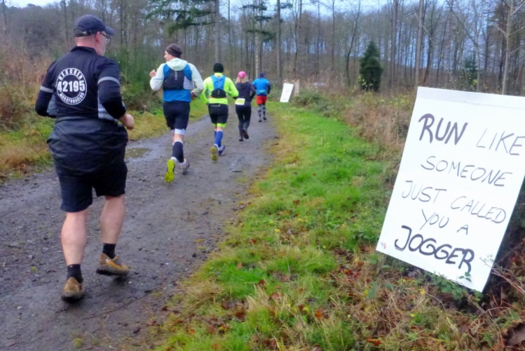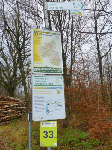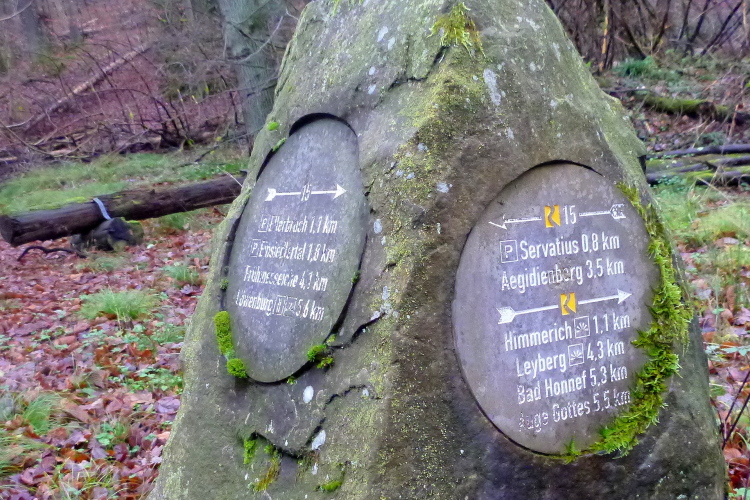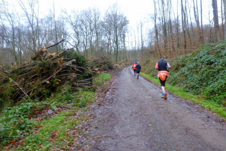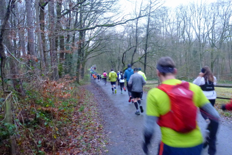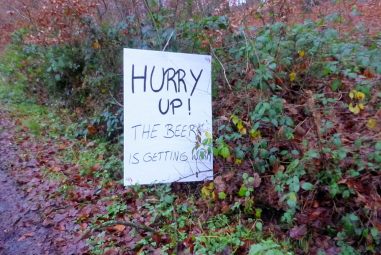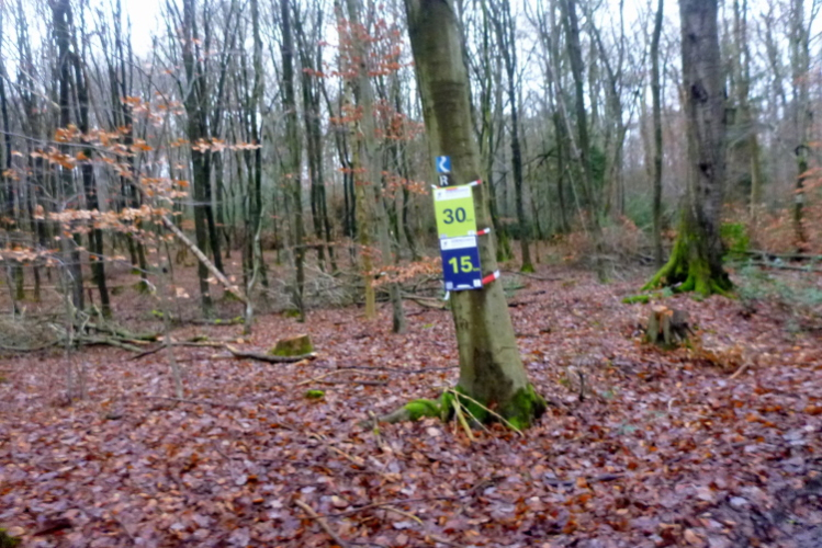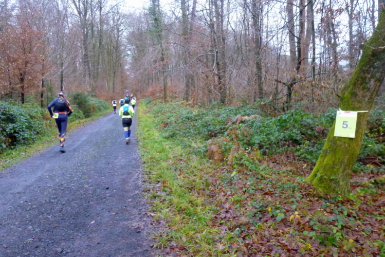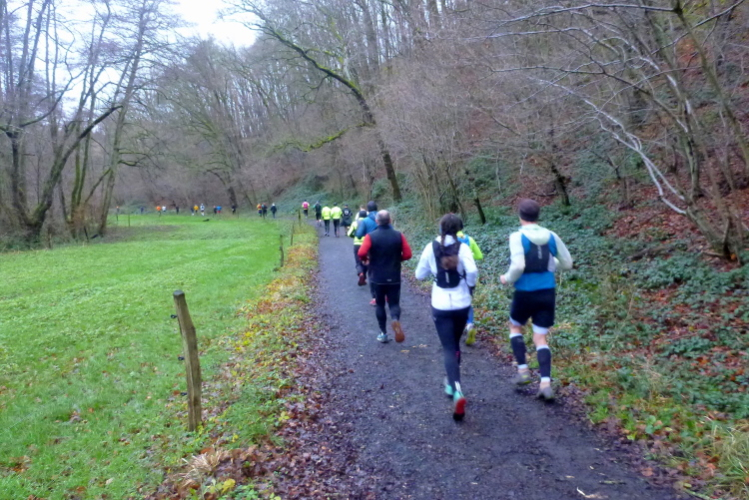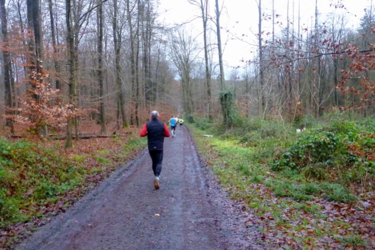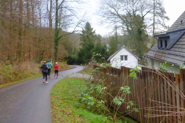 Ach, dann ist da noch eine Überraschung, denn am Start steht man verkehrt herum. Daß die Strecke leicht verändert wurde, hatte ich zwar läuten hören, diese Einzelheit jedoch noch nicht. Egal, diese Flexibilität besitze ich gerade noch. Über insbesondere von den nächtlichen Regenfällen ordentlich aufgeweichten und von tiefen Pfützen durchzogenem Untergrund kommen wir nach einigen Schlenkern auf den Stellweg. Erspart bleibt uns somit der kurze Auftakt durch Aegidienberg mit Inaugenscheinnahme des Km-Schildes 42, kaum daß ein paar hundert Meter zurückgelegt sind. Wegen ein paar Startfotos zunächst ganz hinten, beginne ich mich ganz langsam einige Plätze nach vorne zu arbeiten.