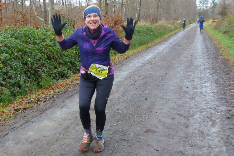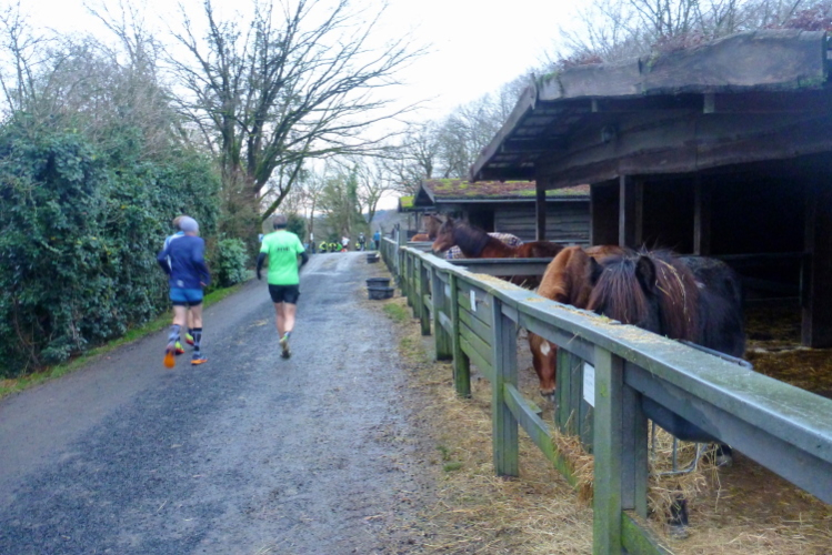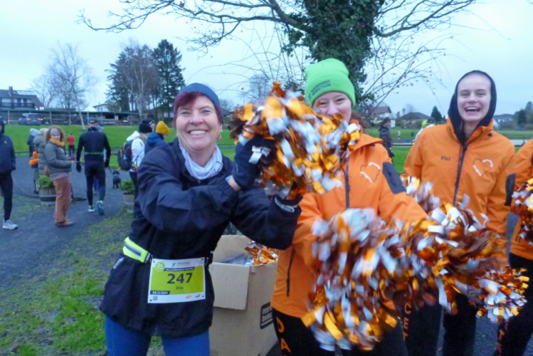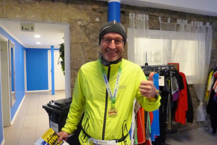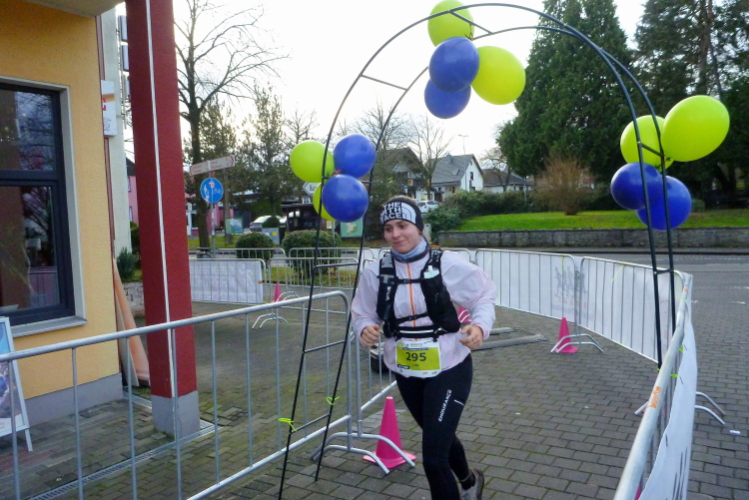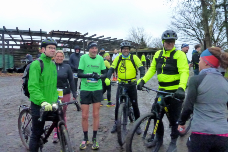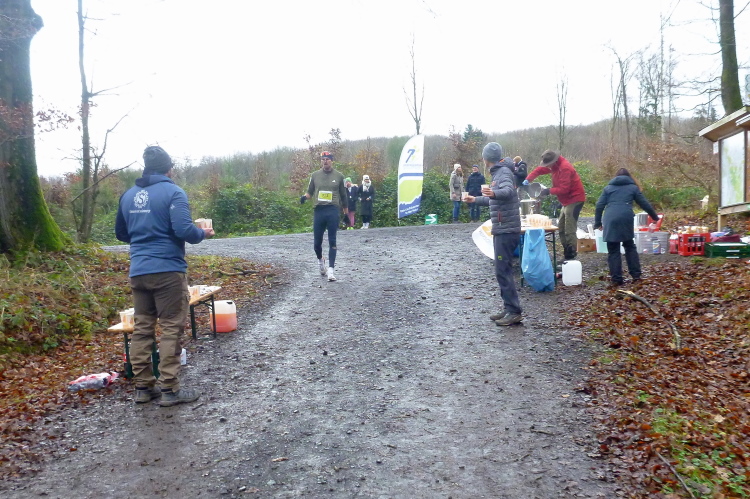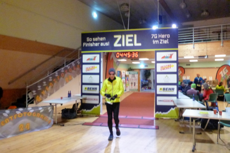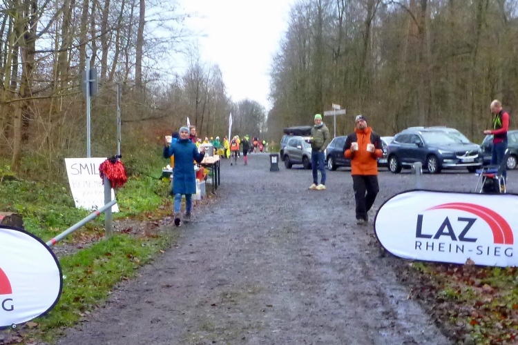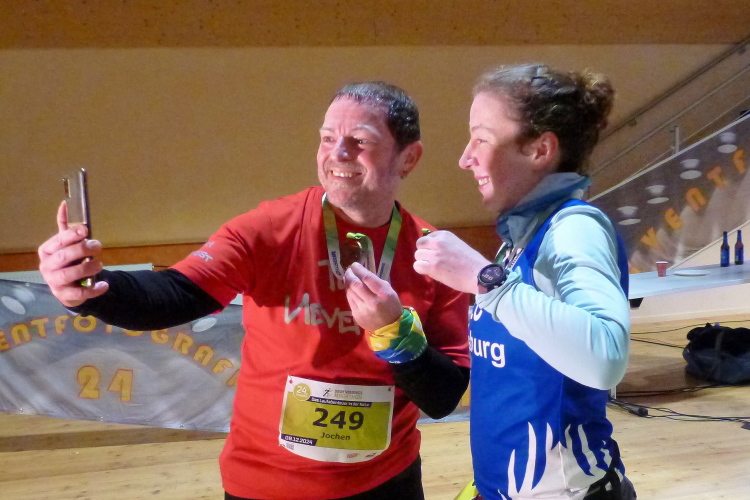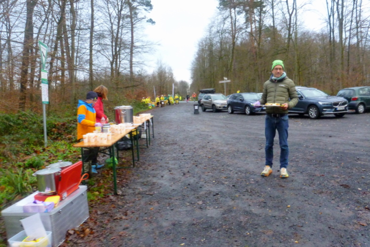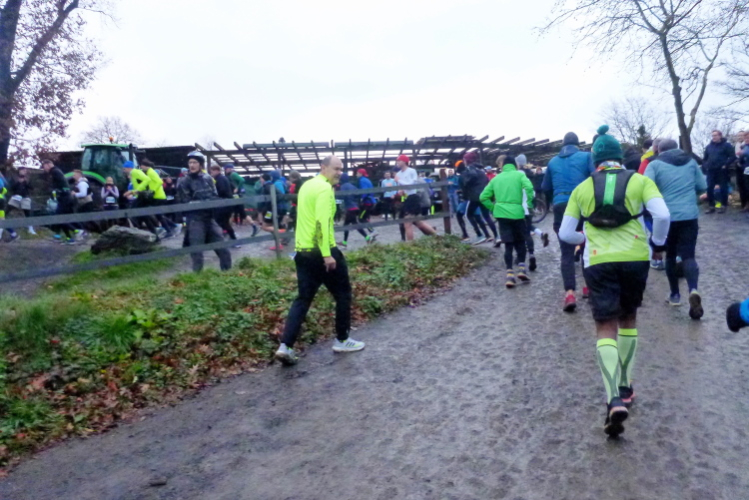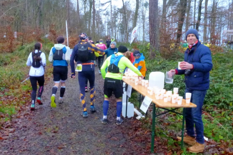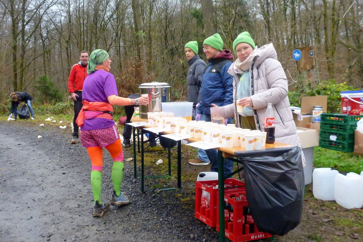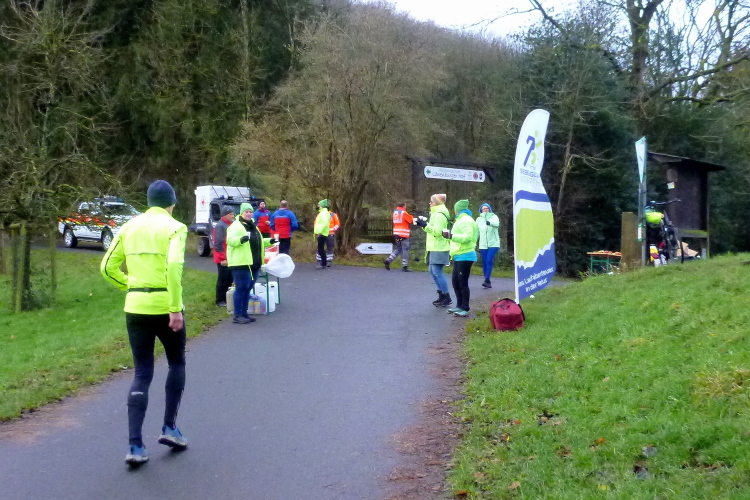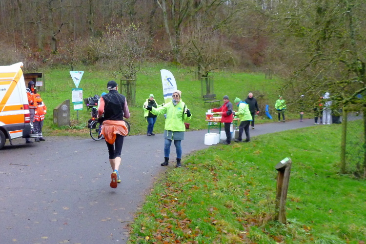 Eine Institution ist auch Thorsten, der Eventfotograf, der nicht nur mich hier bereits zum zweiten Mal abschießt. Seine Birgit erwartet uns im Ziel und sitzt im vergleichsweisen Warmen. Halbzeit ist nach 2:20 Std., alles im Lot. Aufregen muß ich mich an der einen oder anderen Stelle über die wenigen Mitläufer, die zwar gerne z. B. ein volles Geltütchen vom VP mitnehmen, es aber nicht schaffen, das leere bis zur nächsten Entsorgungsmöglichkeit einzustecken. Ein netter Laufkamerad sieht das genau so und macht sich als Müllmann um die Natur verdient.