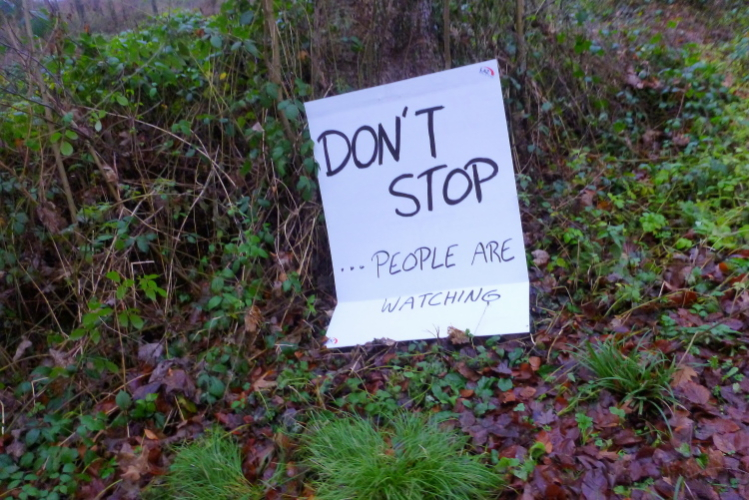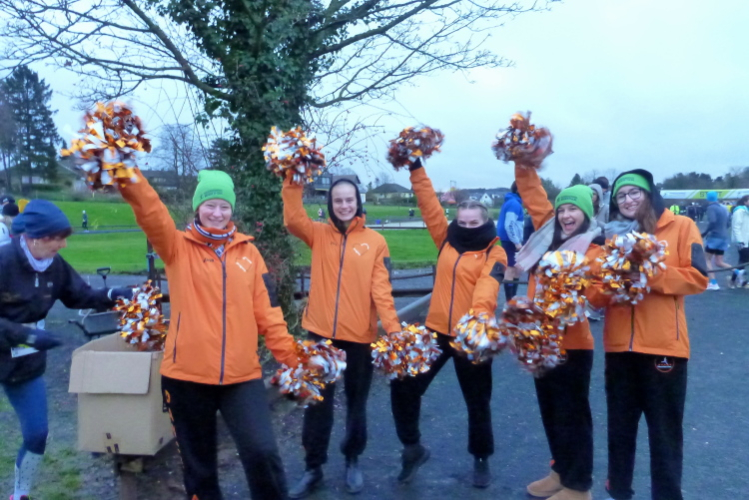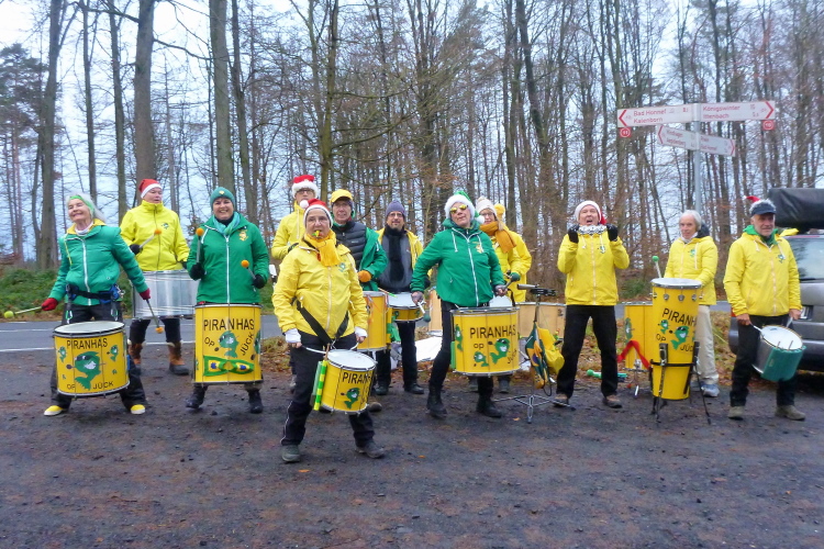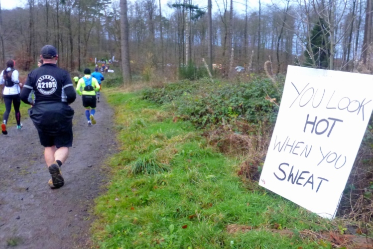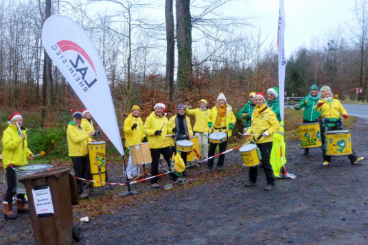 Ein paar Motivationsschilder (warum in englischer Sprache?) im Vorfeld des ersten VP, die hier Ladestationen genannt werden, lockern die Stimmung weiter auf. Zunächst beschränkt man sich richtigerweise auf Flüssiges, Quantität und Qualität der Verpflegung werden im weiteren Verlauf deutlich zunehmen, sogar Gel wird zweimal und auch im Ziel geboten. Die Piranhas, eine Percussion-Sambaband aus (Bonn-)Beuel, heizen uns zum ersten Mal ein, eine weitere, nicht hoch genug zu lobende Neuerung. Wir werden sie später nochmal sehen und hören.