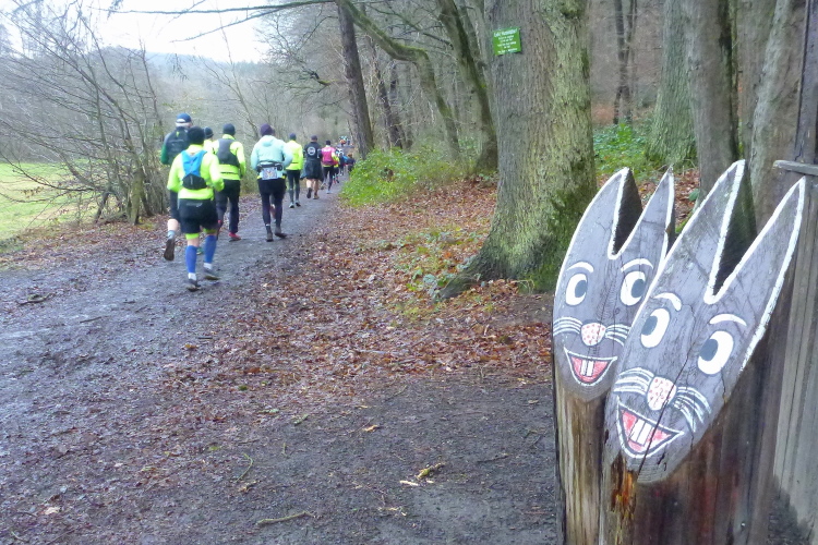 Ach, die Schneewittchenhütte, die muß ich wegen der netten Figuren immer wieder fotografieren, verliere dabei aber leider den Olli, mit dem ich gerne weiter zusammen gelaufen wäre. In Pulheim haben wir dieses Marathon-Laufjahr gemeinsam begonnen und werden es heute auch gemeinsam beenden. Es ist 9:20 Uhr, hinter uns starten jetzt die Halbmarathoner.