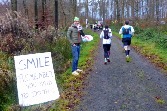 Die ersten sanften Aufs und Abs stimmen uns auf die kommenden Höhenmeter ein. An jeder Abbiegung, an der man sich verlaufen könnte, steht ein freundlicher Streckenposten und hält uns auf dem Pfad der Tugend. Dann gehe ich das erste Mal zur Sicherheit ein paar Meter, als es kurz strammer bergauf geht, aber das ist gleich geschafft. Klar, wer jung und bergerprobt ist, joggt das von Anfang bis zum Ende locker durch.
