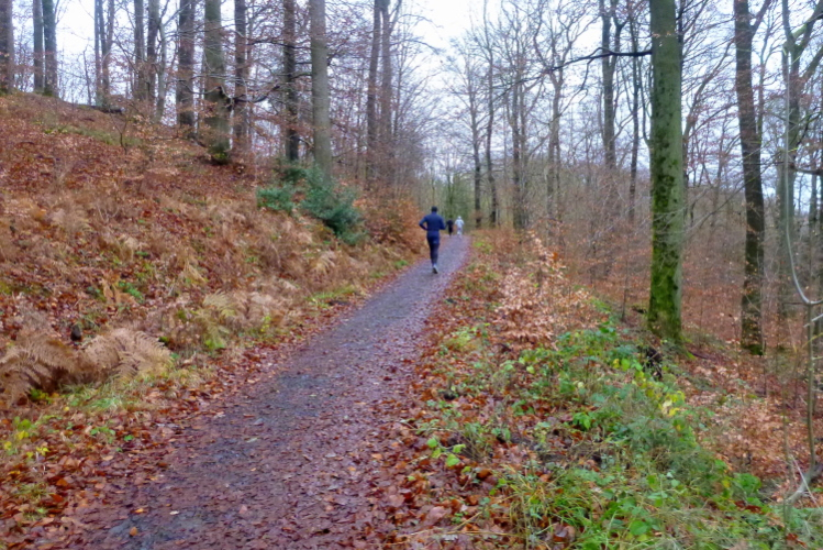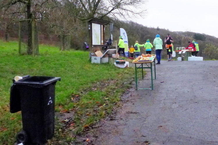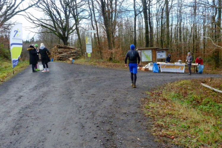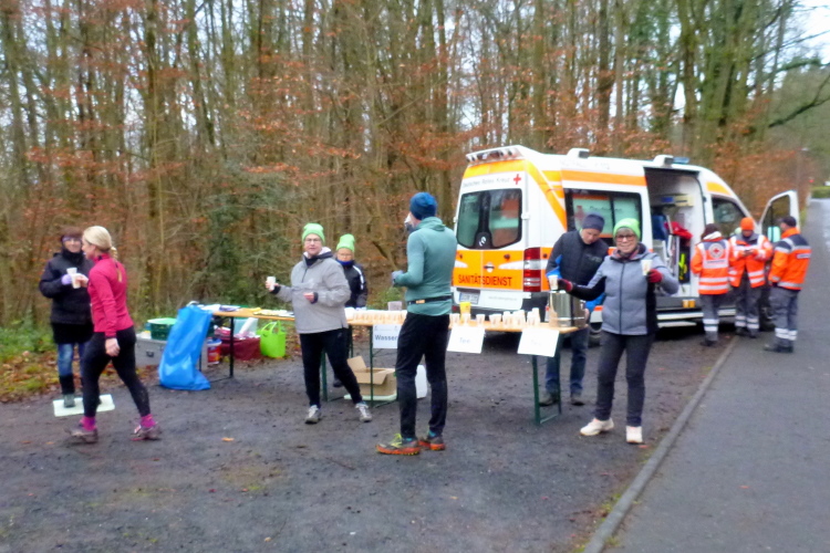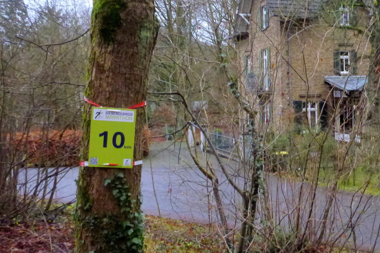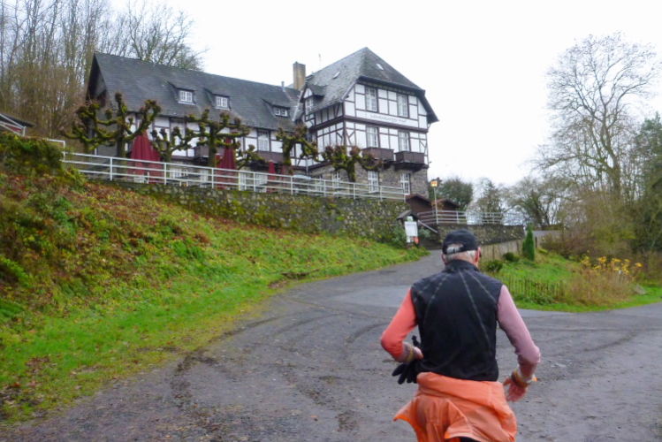 Die traditionelle Runde um die Löwenburg beginnt an der zweiten Ladestation, das Buffet ist bereits sehr reichhaltig, die Auswahl fällt schwer. An der Ittenbacher Margarethenhöhe sind die ersten zehn km absolviert, das Gelände ist mir nicht nur vom Siebengebirgsmarathon sehr vertraut. Das Ausflugslokal unterhalb der Löwenburg hat mir mal auf einem der Rheinsteig-Erlebnisläufe quasi das Leben gerettet. Das würde bei Bedarf auch das DRK machen, aber deren Auto bleibt heute wohl ungenutzt.