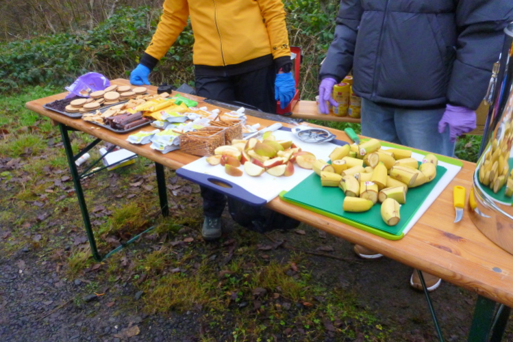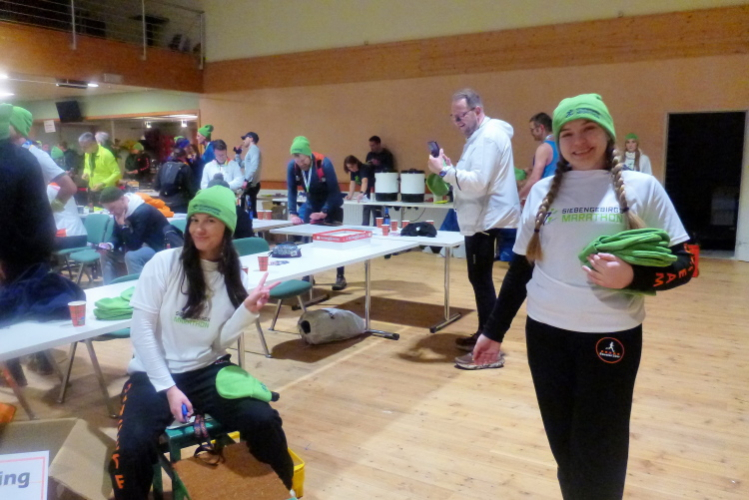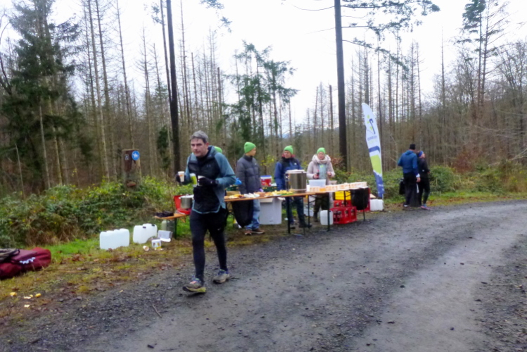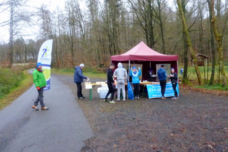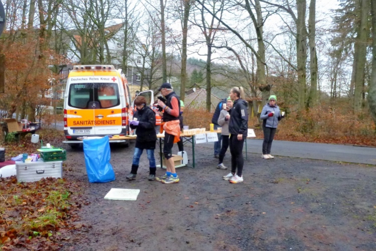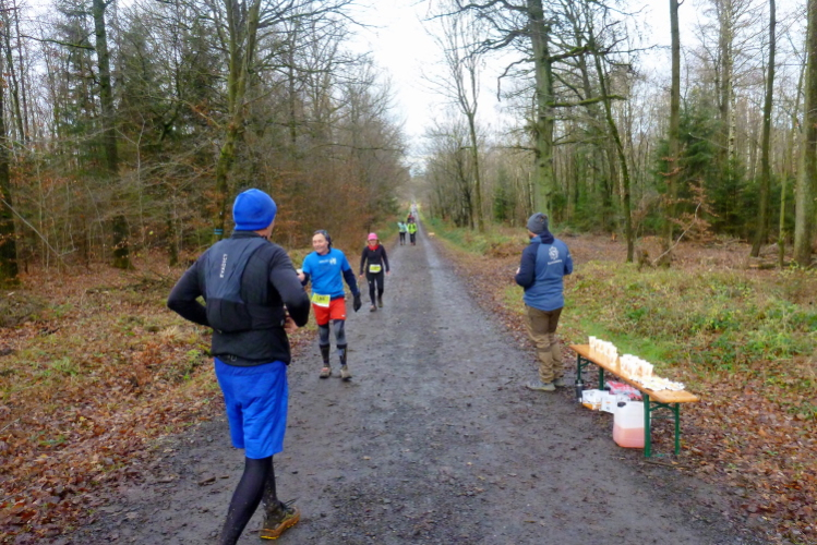 Zehnmal Verpflegung an „Ladestationen“ (einige doppelt anzulaufen) mit Wasser, Iso und Tee (warm!), später zusätzlich Cola sowie Bananen und Riegel. Auf der zweiten Hälfte (neu!) an jeder Ladestation Gel. Gute und reichhaltige Zielverpflegung.