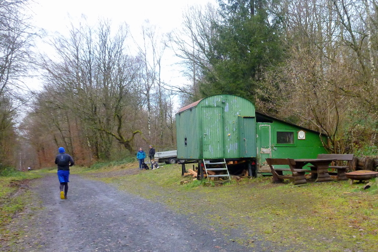 Ah, dann endlich ist der grüne Bauwagen da und sorgt für fast heimatliche Gefühle. Er ist tatsächlich trotz der grundsätzlichen Beweglichkeit so etwas wie ein Fixpunkt während dieses Laufs. Wieder mal ist eine Runde gedreht und am hier erneut angelaufenen VP entdeckt mich Kris beim Becherauffüllen. „Bin wieder fit und komme zu Dir zum Bärenkopplauf am 1. August!“ Damit hätten wir auch das geklärt und Heinz wird Konkurrenz in der M75 bekommen.