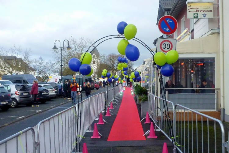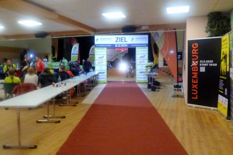 Toll, was man sich für die finalen Meter hat einfallen lassen, ein sehr stimmungsvoller Zieleinlauf folgt. Mit Gittern ist der Einlaufkanal abgesichert, mehrere luftballongeschmückte Bögen zieren diesen, und der Clou: Man hat uns einen roten Teppich ausgelegt. Wer die Woche vorher in Valencia war, genießt jetzt den zweiten Teppicheinlauf, nur nicht in Blau. Und wer sich ein wenig an Frankfurt erinnert fühlt, liegt nicht verkehrt, denn der Einlauf ins Bürgerhaus hat auch etwas für sich, wenngleich natürlich mehrere Nummern kleiner.