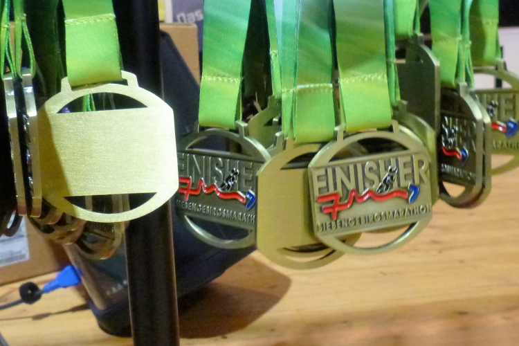 Nach 4:42 Std. habe ich fertig. Von Birgit abgelichtet, gibt es im Tausch gegen den (erstmals verwendeten) Chip die Medaille sowie eine hübsche Mütze mit dem Lauflogo. Dann warten die Zielverpflegung und das reichhaltige Kuchen- sowie Pastabuffet gegen kleines Geld der Vernichtung.
