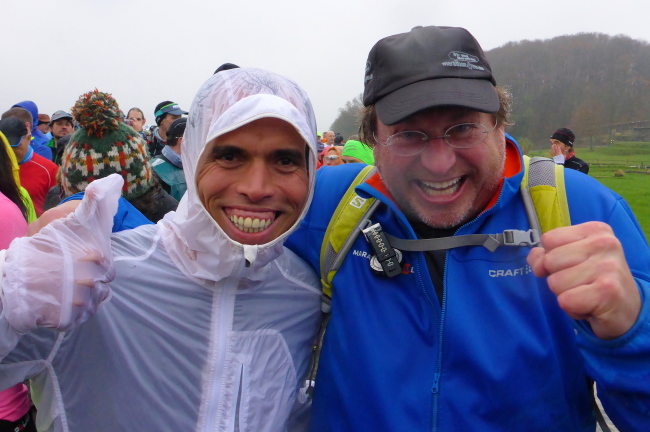 Es gab Jahre beim Siebengebirgsmarathon, da hatten wir kein Wort gesprochen, damit uns nicht die Zunge abfror. Heute ist die Stimmung grandios, es wird aufgeregt geplappert. Wir stehen im Schlamm, der pausenlos von einer braunen, stark riechende Flüssigkeit, die von den Pferdeschuppen kommt, aufgesuppt wird. Es ist das Wetter, bei dem man keinen Läufer und keinen Hund vor die Tür schickt.