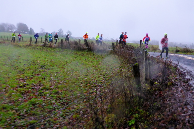 Schon kurz nach dem Lauf durchs Dorf wird es noch dreckiger, es geht in den Wald. Es läuft gut bei mir, aber ich muss für Fotos anhalten, es ist zu dunkel heute. Die Linse ist immer wieder verschmiert, habe nichts Trockenes mehr, die Kamera fokussiert automatisch lieber Regentropfen als Läufer.
