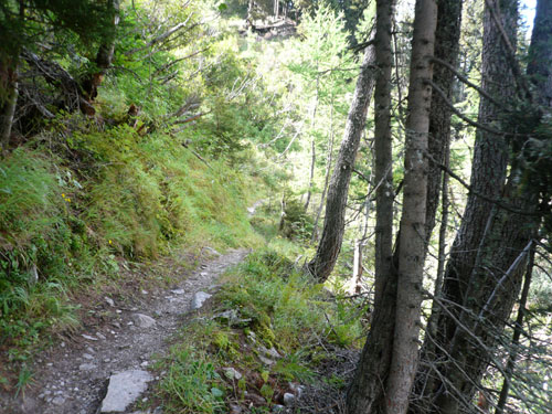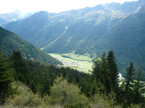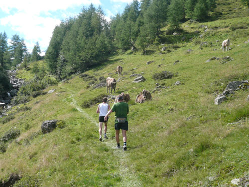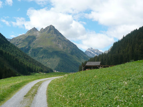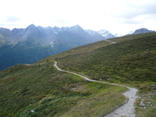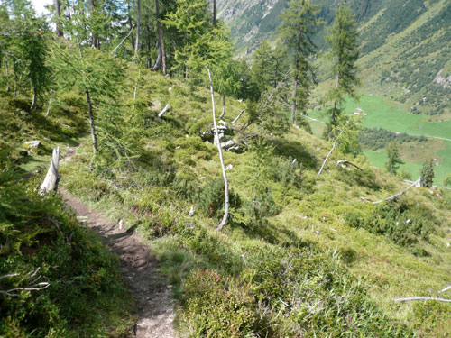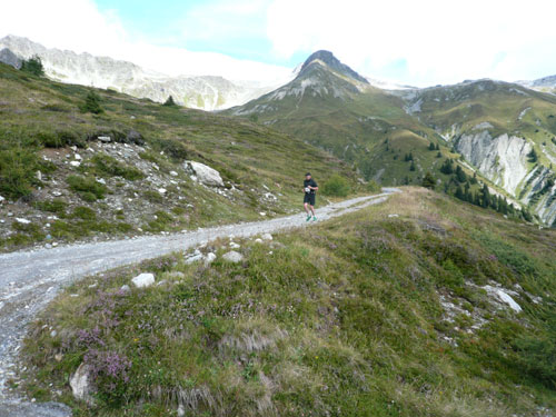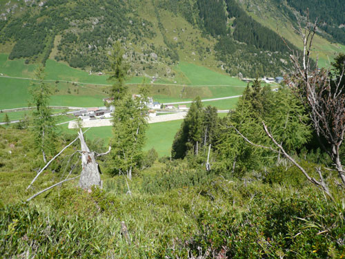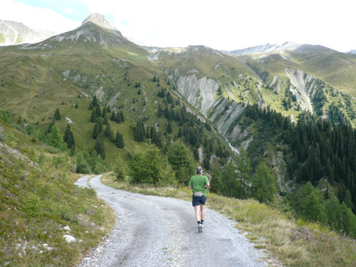 Genau zur Mittagszeit sind wir mit unserer Stärkung fertig. Für die letzten ca. 7,5 km müssen wir uns aber noch etwas sputen, um unter 6 Std. zu bleiben, da es auch noch bergauf geht. Auf dem Galtürer Höhenweg unterhalb des Predigtberg laufen wir auf einem welligen Singletrail, aber überwiegend leicht abfallend am Hang entlang ins Jamtal. Immer wieder bekommen wir eine herrliche Aussicht ins 300 m tiefer gelegene Tal geboten. An der Eggalm gibt es die letzte Richtungsänderung, von hier führt der Kurs nur mehr bergab nach Galtür zurück.