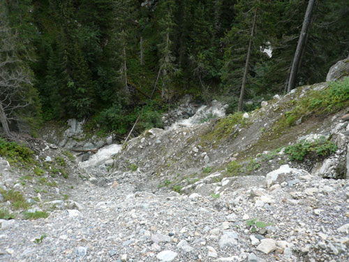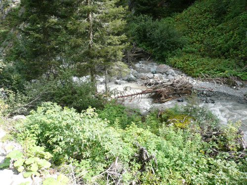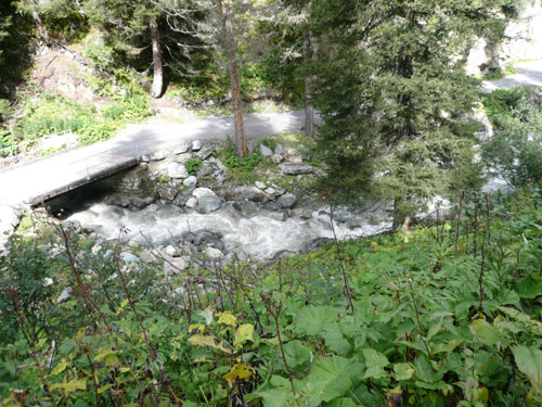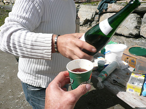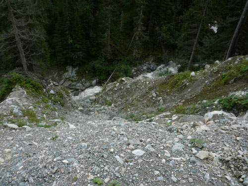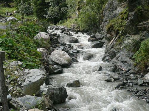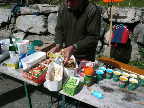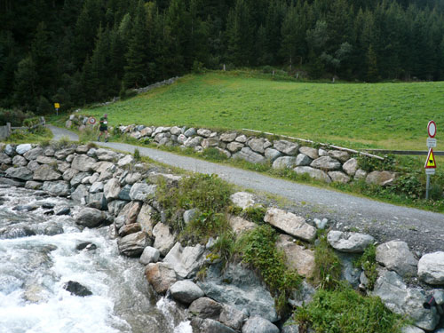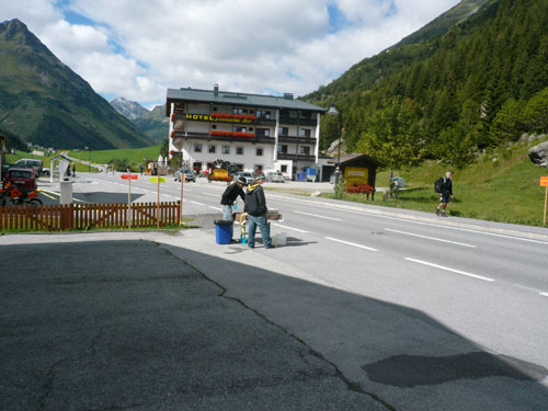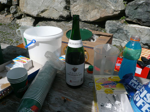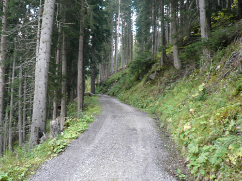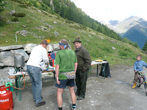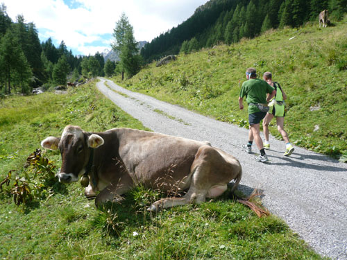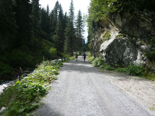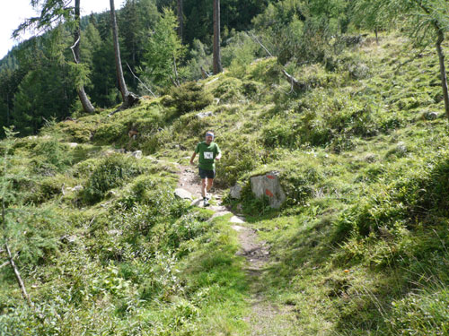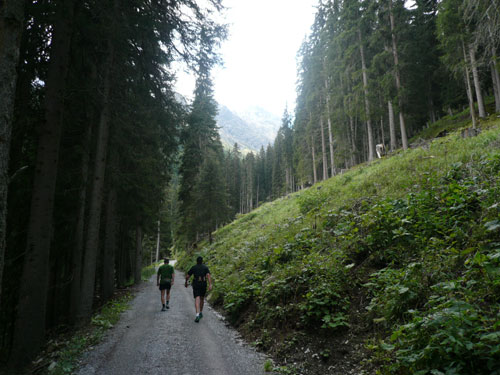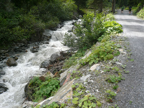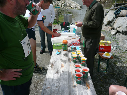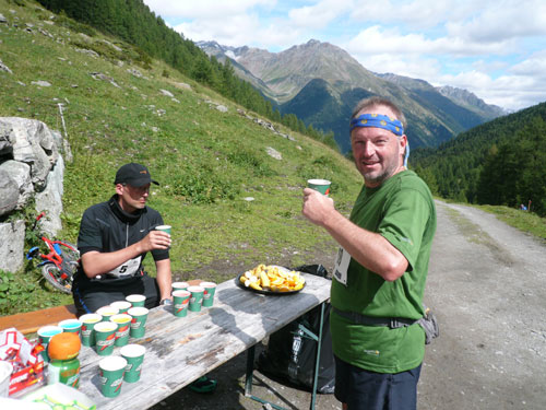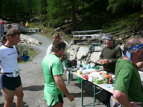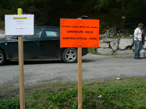 Das letzte Drittel legen wir am Nordrand der Silvretta-Gruppe zurück. Durch den hohen Wald geht es an tiefen Schluchten mit tosenden Wasserfällen vorbei hinauf zur Lareinalpe, wobei weitere 330 Höhenmeter bewältigt werden. Die Halbmarathonläufer, die um 11 Uhr gestartet sind, kommen so nach und nach von hinten und beleben unsere Strecke. Die letzte Verpflegungsstation ist an der Lareinalpe (km 35) aufgebaut und die hat es in sich. Zum Verköstigen ist wieder alles und reichlich vorhanden was das Herz begehrt. Der Stationsmeister hat einen Kessel mit frischen Tee, mit richtig fruchtigen Inhalt gebrüht. Dann sehe ich noch ganz unbeteiligt eine Flasche „Kalterer See“ rumstehen. Die Hälfte meines Bechers mit Tee wird mir dem Traubensaft verfeinert und weil’s so lecker geschmeckt hat, schnorre ich mir noch einen weiteren Mix des edlen Getränkes. Franz schließt sich mir sofort an.