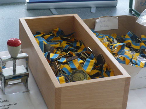 Der 100 m lange Zieleinlauf über eine Wiese führt uns bei mittlerweile angenehmen Temperaturen im zweistelligen Bereich ins Sport- und Kulturzentrum. Der Leihchip wird uns von Kindern sofort vom Fuß genommen und ein Getränk überreicht. In der Sporthalle kann die verdiente Siegermedaille abgeholt werden. Franz hat sein Ziel erreicht, die 5 steht! Ich habe meines ebenso erreicht, leichte Muskelprobleme vom Ultra Trail vor einer Woche konnte ich durch defensive Laufweise in Grenzen halten.