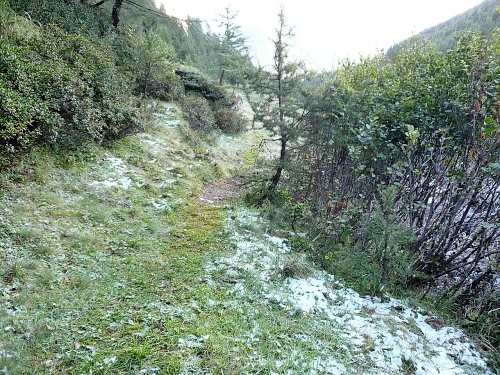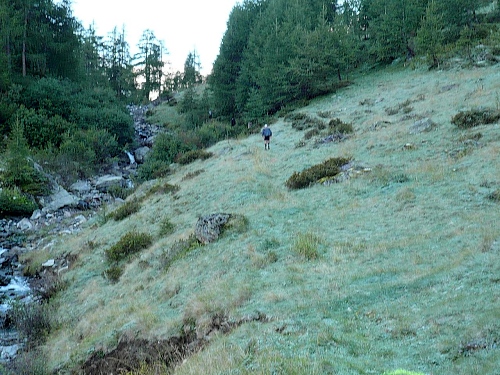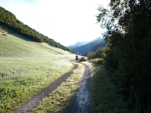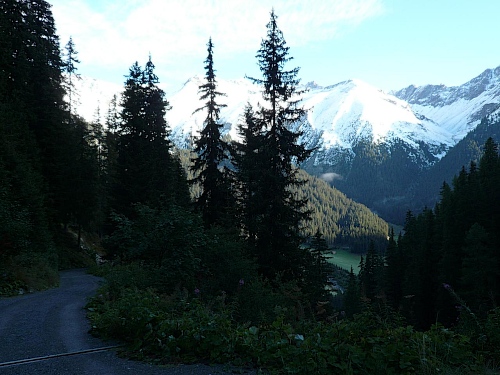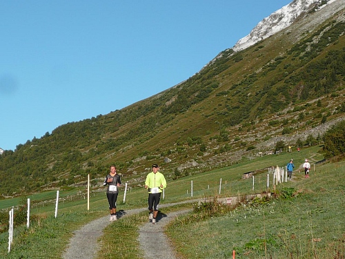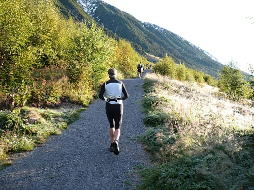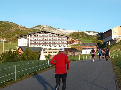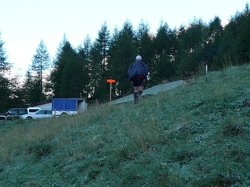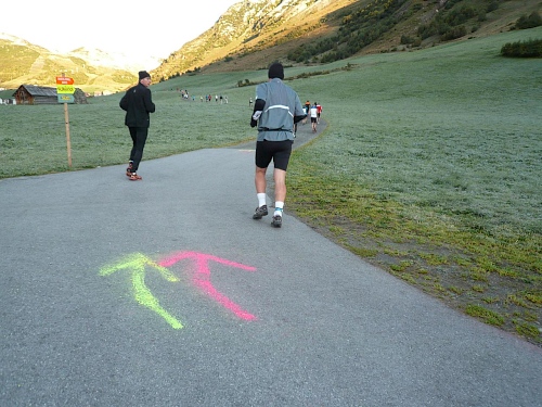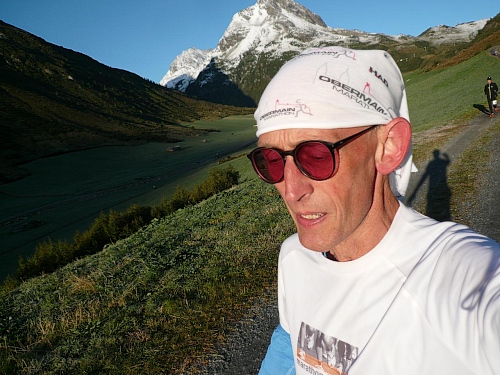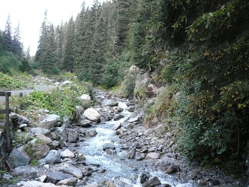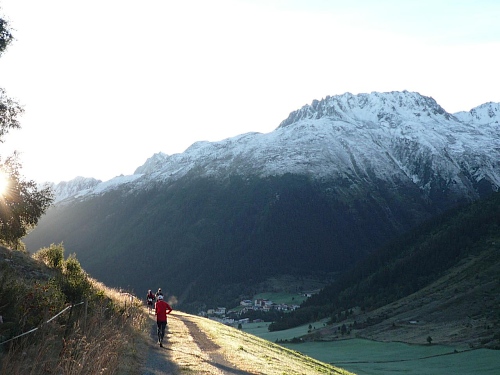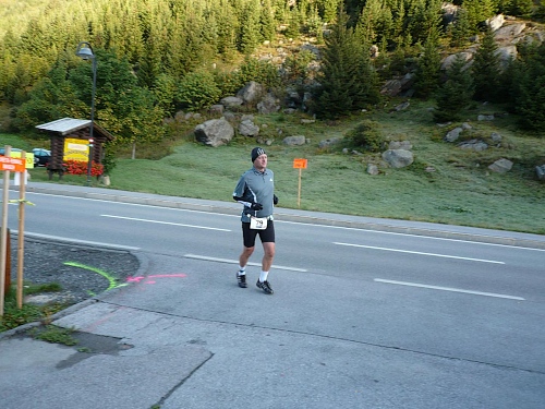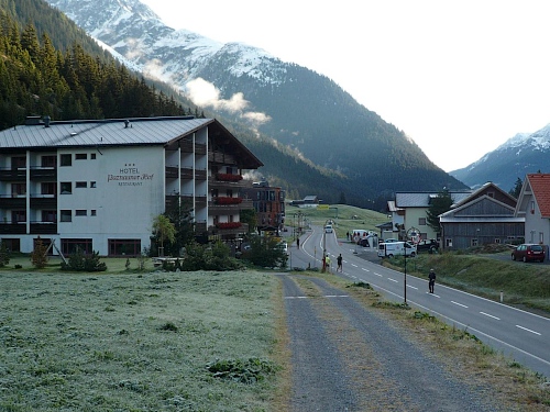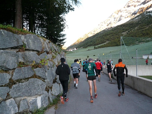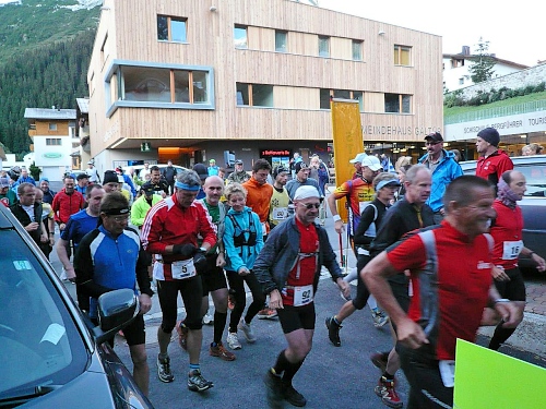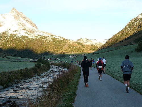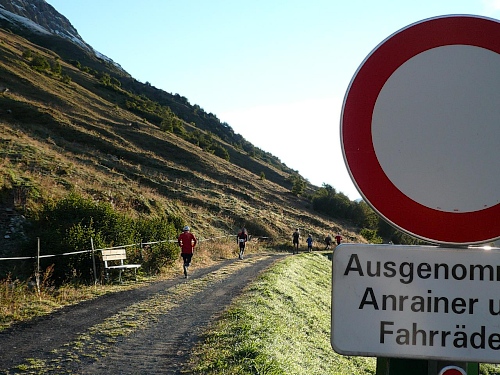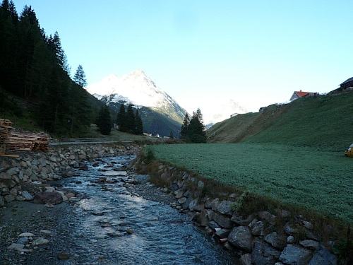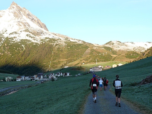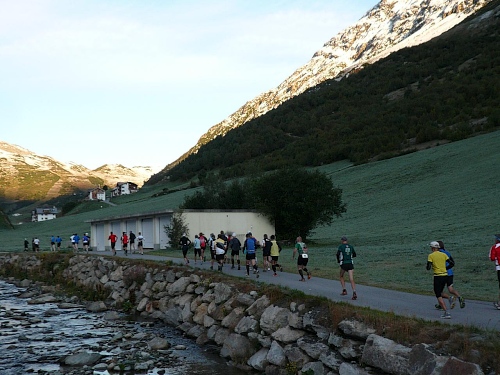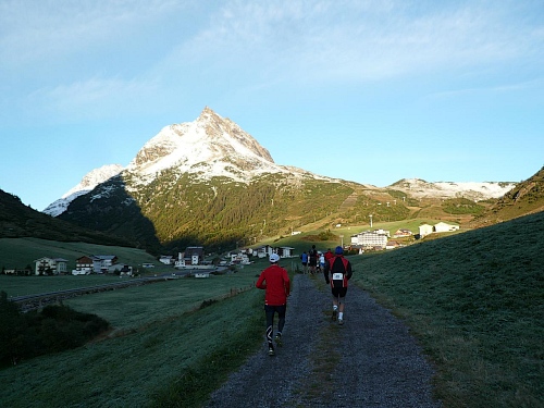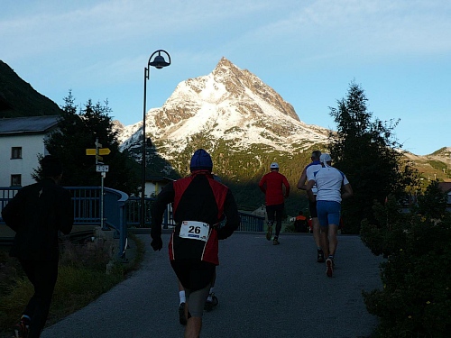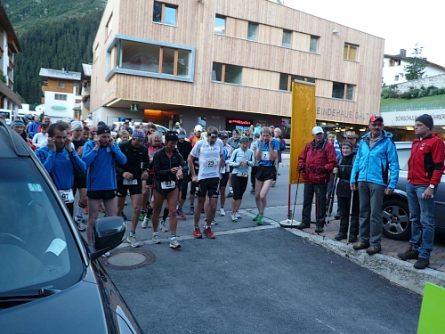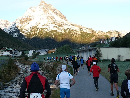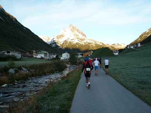 Pünktlich um sieben haut die Kanone die allerletzten aus dem Bett und uns auf die Strecke. Ich sehe noch einige, auch aus dem Spitzenfeld, wie sie sich die Ohrwaschel zuhalten. Es geht den schmalen Weg leicht bergab und kurz nach der Sportanlage überqueren wir die Trisanna, verlassen Galtür (1564 Meter) und biegen links ab. Es geht bachaufwärts Richtung Wirl. Durch meine Fotoarbeit bin ich fast am Ende des Feldes. Meine Taktik ist wieder die übliche. Erste Runde mehr fotografieren und dann Tempo machen. Wenn es mir gelingt, dann möchte ich die zweite Runde keine Gehpause machen und vielleicht sub vier Stunden finishen. Das wär für mich Rekord.