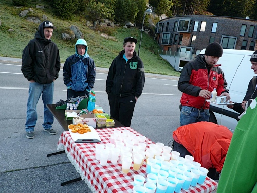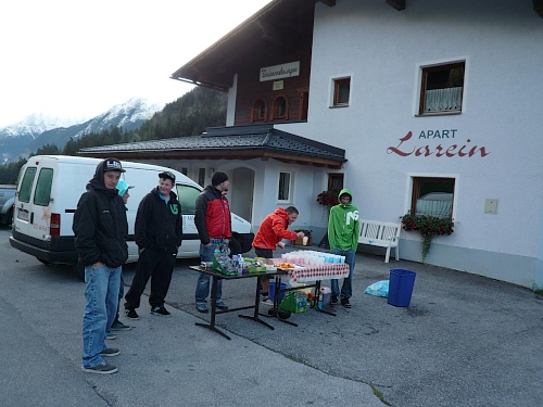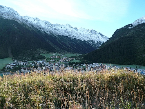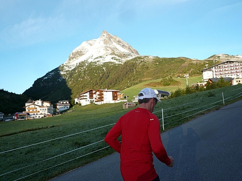 Dafür ist die Aussicht auf unseren Startort genial, man kann einen weiten Blick in das Jamtal werfen oder auf den gegenüberliegenden Predigberg (2645 Meter), der schon zur Silvretta gehört. Am Ende des Sonnenweges, ich nenne ihn nun so, geht es wieder gefällig ins Tal hinab beim Paznaunerhof. Dort können wir verpflegen. Vorher hilft uns jedoch die Polizei über die Straße. Die erste V-Stelle bietet allerlei. Iso in mehreren Farben, Waffelschnitten, Gel, Salzbrezeln, Orangenschnitze und Traubenzucker. Ein Getränke kippe ich mir hinter die Binde und weiter.